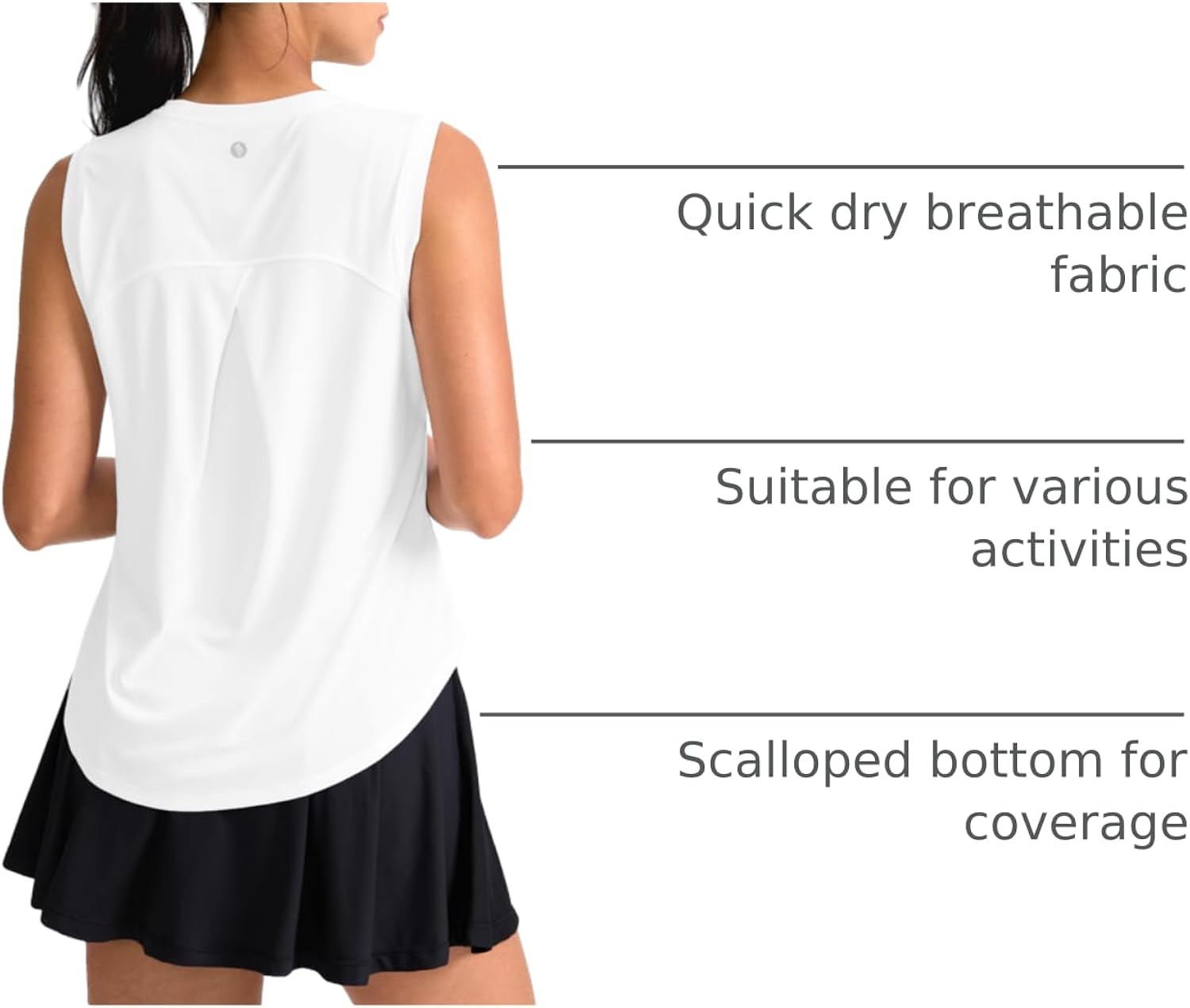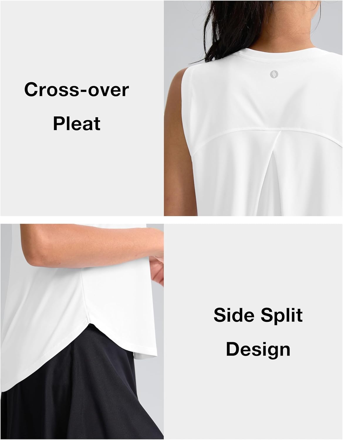 Back Cross-over Pleat: Our athletic tank drapes beautifully thanks to the cross-over pleat at back yoke. The crossing detail is cute and flattering, engineered to keep the top from clinging to your sweaty body while running.