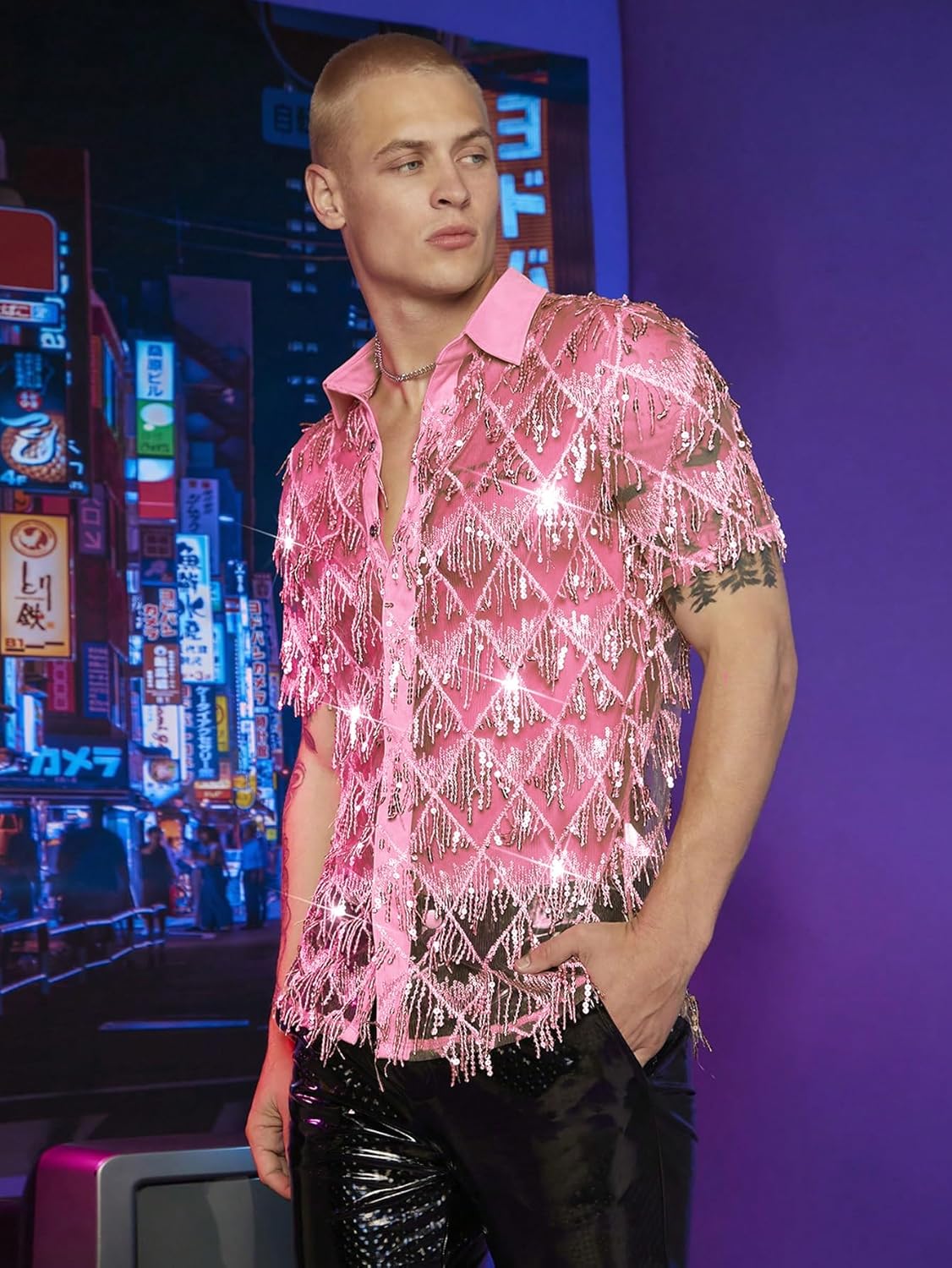 Features: contrast sequin, fringe, sheer, button front, shirt collar