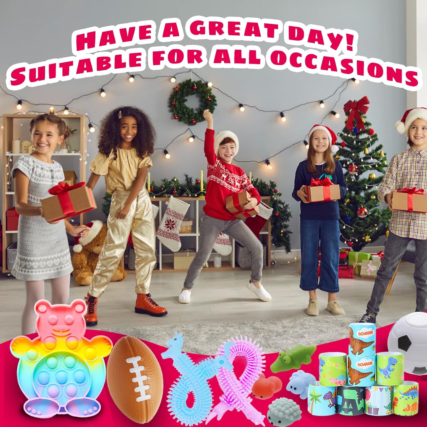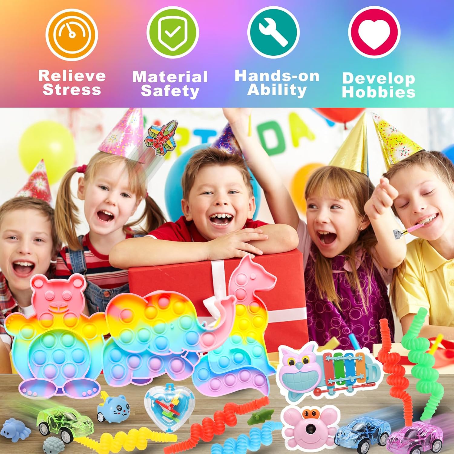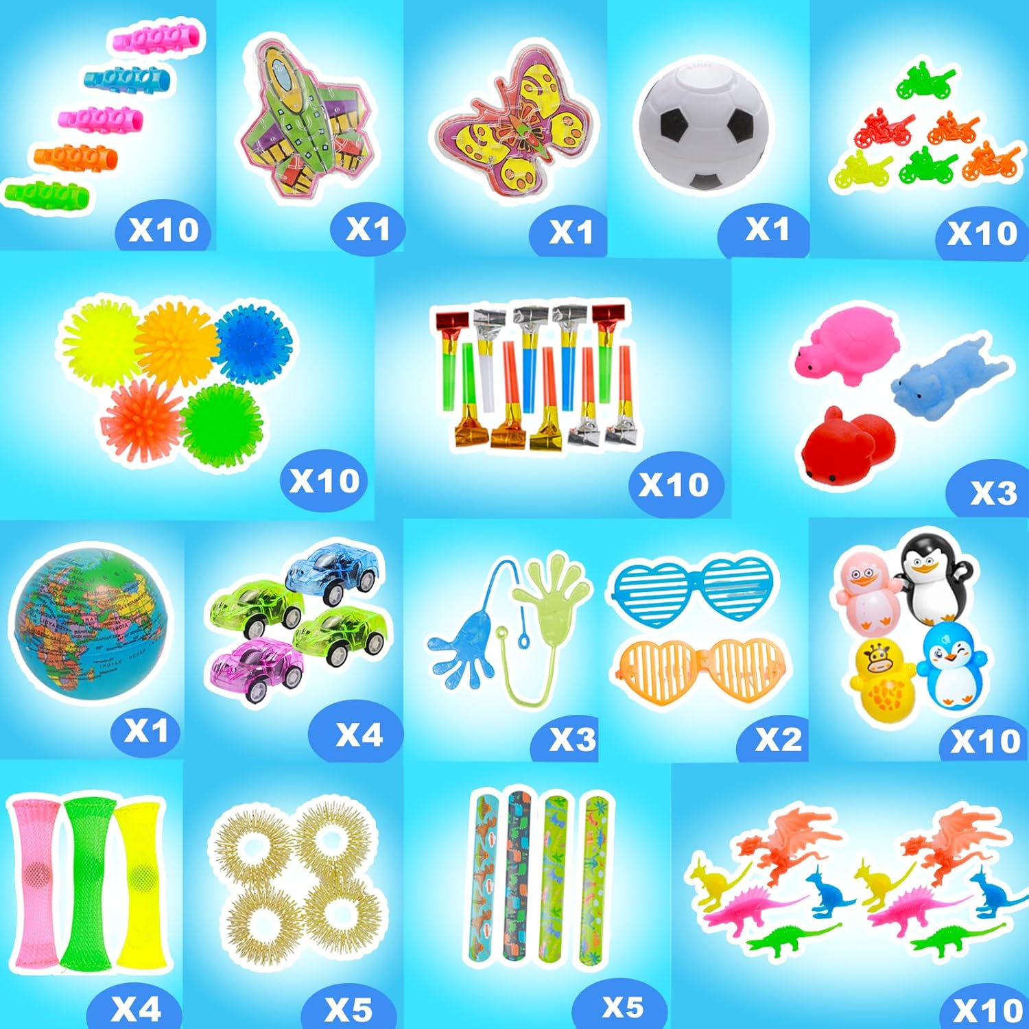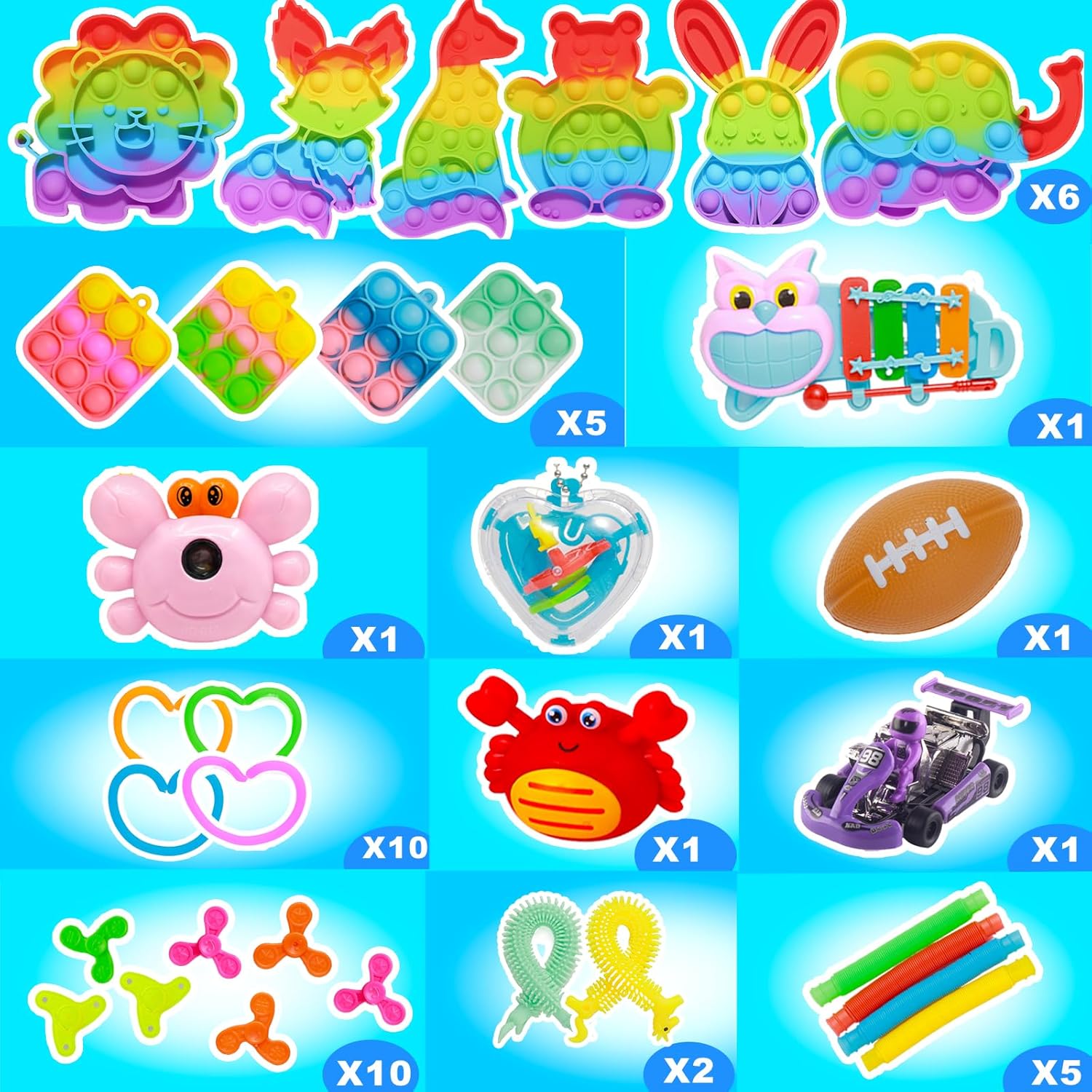 PRODUCTS LIST: 6x fidget poppers are Fox, dog, elephant, lion, bear, rabbit,1x mini marimba,1x crab camera,2x stress ball,3x mochi squishy,5x fidget keychain,5x sensory rings,3x sticky hands,10x spiky ball,4x fidget tubes,1x squishies ball,1x pop fidget spinner,3x maze,5x slap bracelet,12x stretchy string,10x tumblers,6x pull back car,1x fidget spinners soccer ball,etc