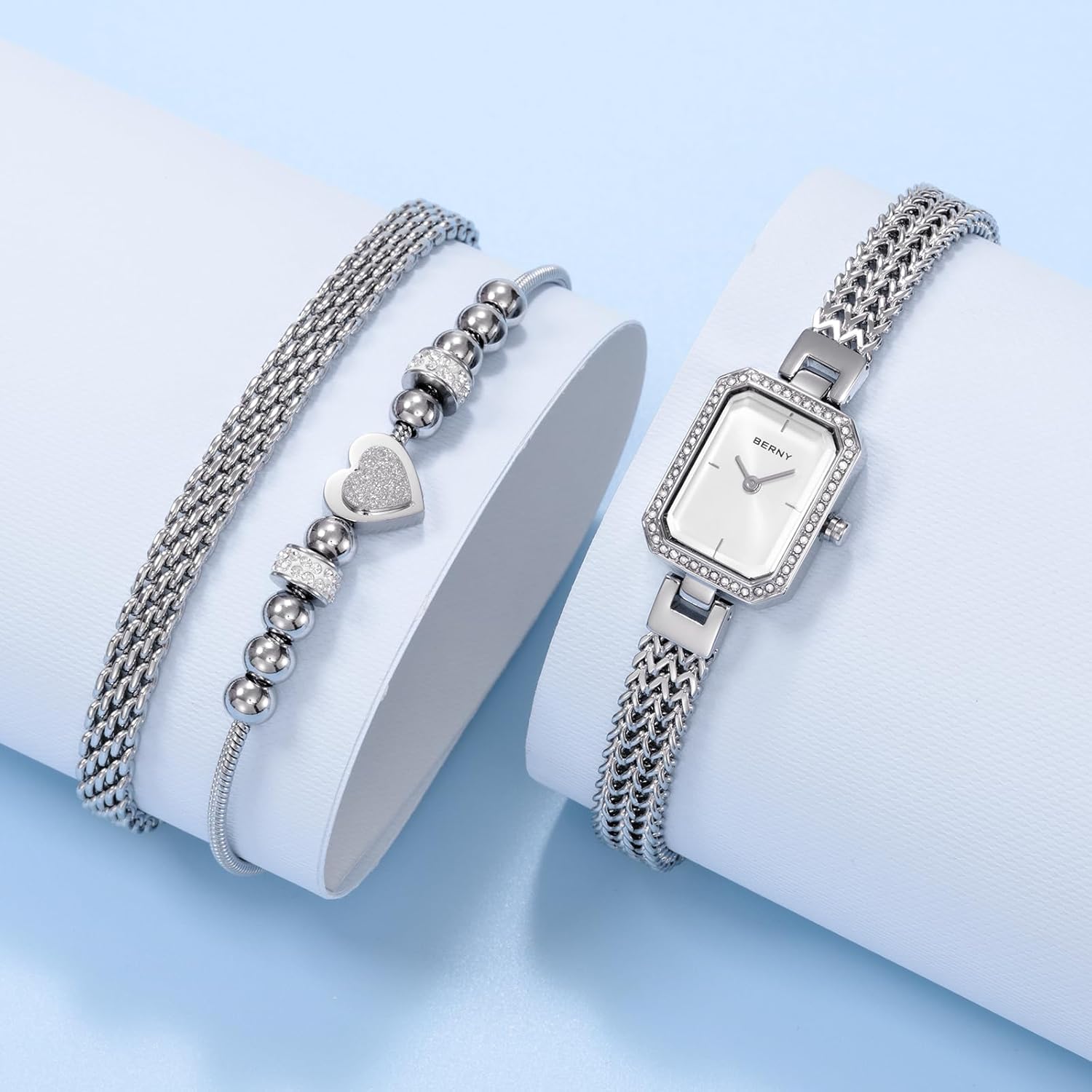 【Reliable Materials】Crafted with a solid stainless steel case and strap, this set is finished with a jewelry clasp that not only enhances the texture but also underscores its elegance. With 3ATM water resistance, it meets daily waterproofing needs with ease.