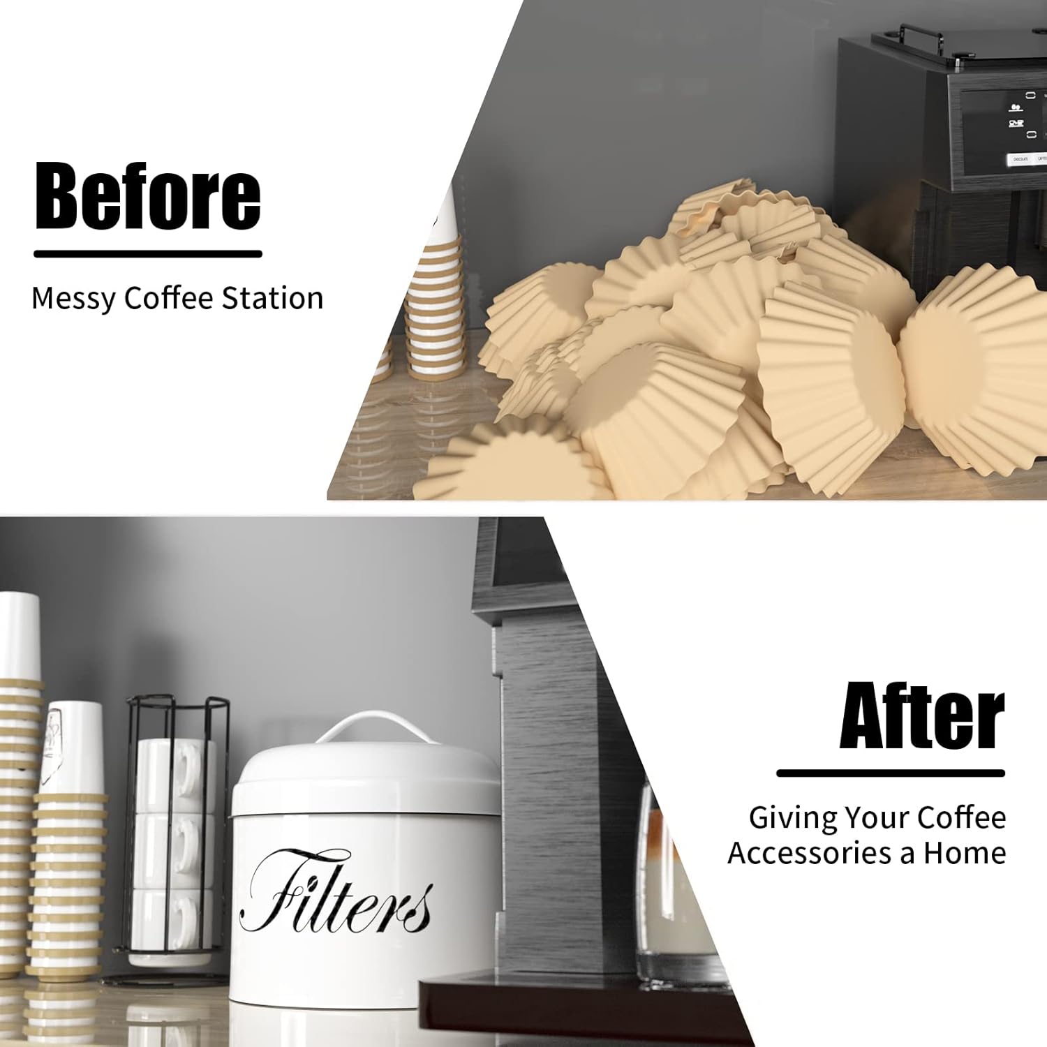 COFFEE BAR DECOR ACCESSORIES : This coffee filter storage is great way to hide unsightly coffee filters without taking up space anymore! It is a nice addition to your coffee bar decor. The round can be placed anywhere near the coffee machine, on the counter or on a shelf, it is easier to reach than a wall-mounted coffee filter holder and saves you brewing time