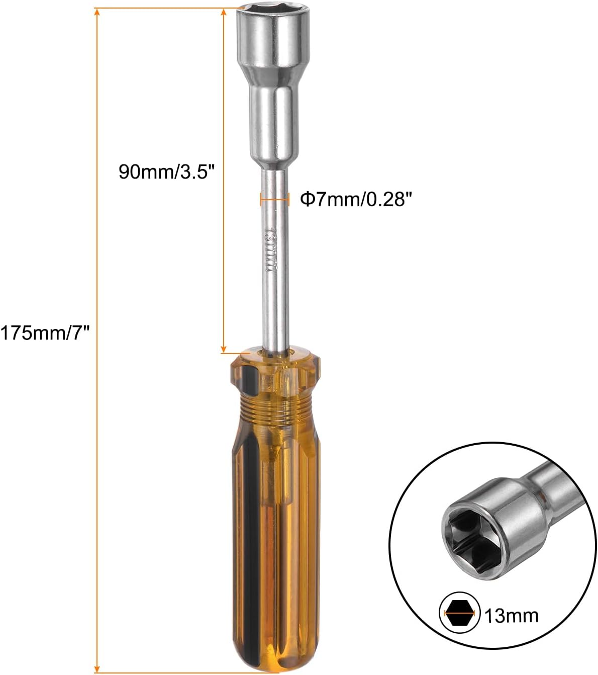 Size - Total Length: 175mm/7", Bar Diameter:7mm/0.28", Bar Length: 90mm/3.5", Socket Size: 13mm.