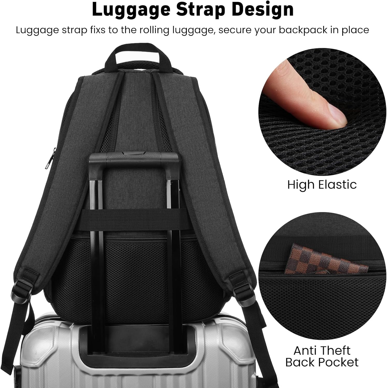 【FUNCTIONAL BACKPACK】Zipper with the metal matte pullers allows it to slide easily and smoothly. A luggage strap allows travel laptop bag fit on luggage/suitcase, slide over the luggage upright handle tube for easier carrying. An anti-theft pocket located on the lower back keeps your passport, wallet, phone and other valuable items safe and handy.