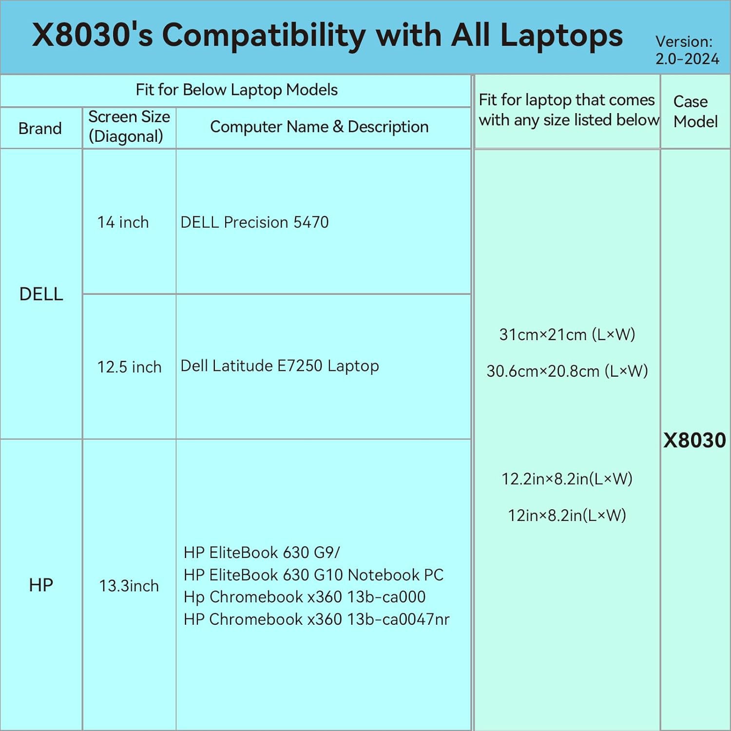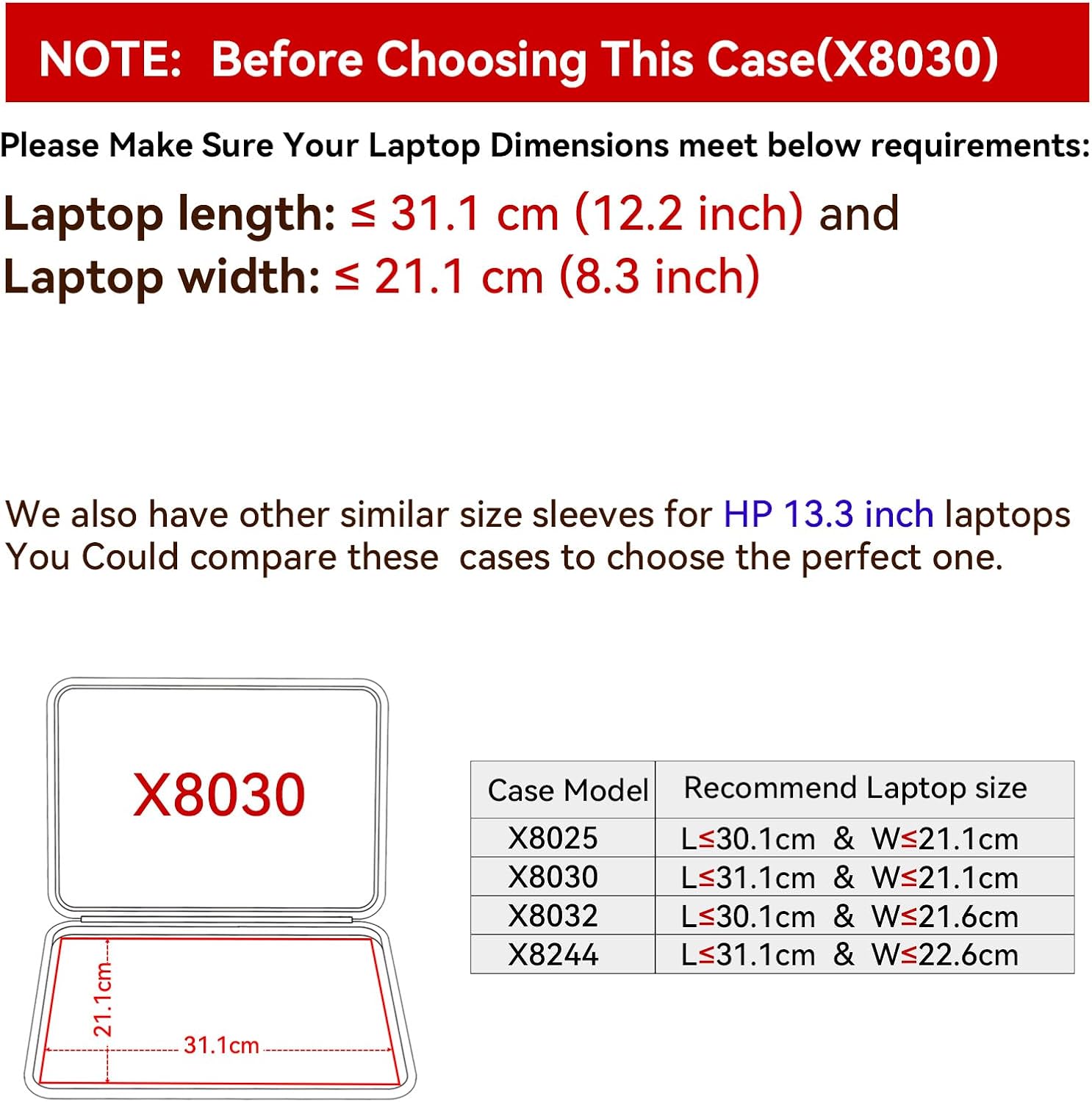 Model No.: X8030: internal dimensions of the case: 31.6x21.2x2.7 cm (12.4 x8.3 x1.1 inch ).Recommend Laptop Size:31.1x21.1x2.2 cm.Please confirm your laptop dimension. If the size of your laptop exceeds our recommended dimensions on any side, this sleeve will not fit your laptop