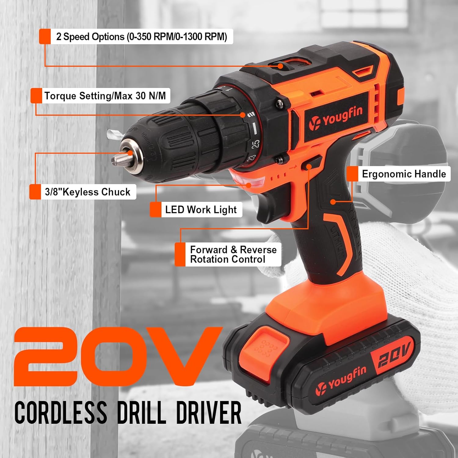 【Powerful and Long-lasting Performance】: The Yougfin power tool combo kit comes with 2 pack rechargeable 1.5Ah lithium-ion batteries that provide 20 volts of power each, ensuring uninterrupted usage during any project. The fast charger enables a quick full battery charge, saving your valuable time.
