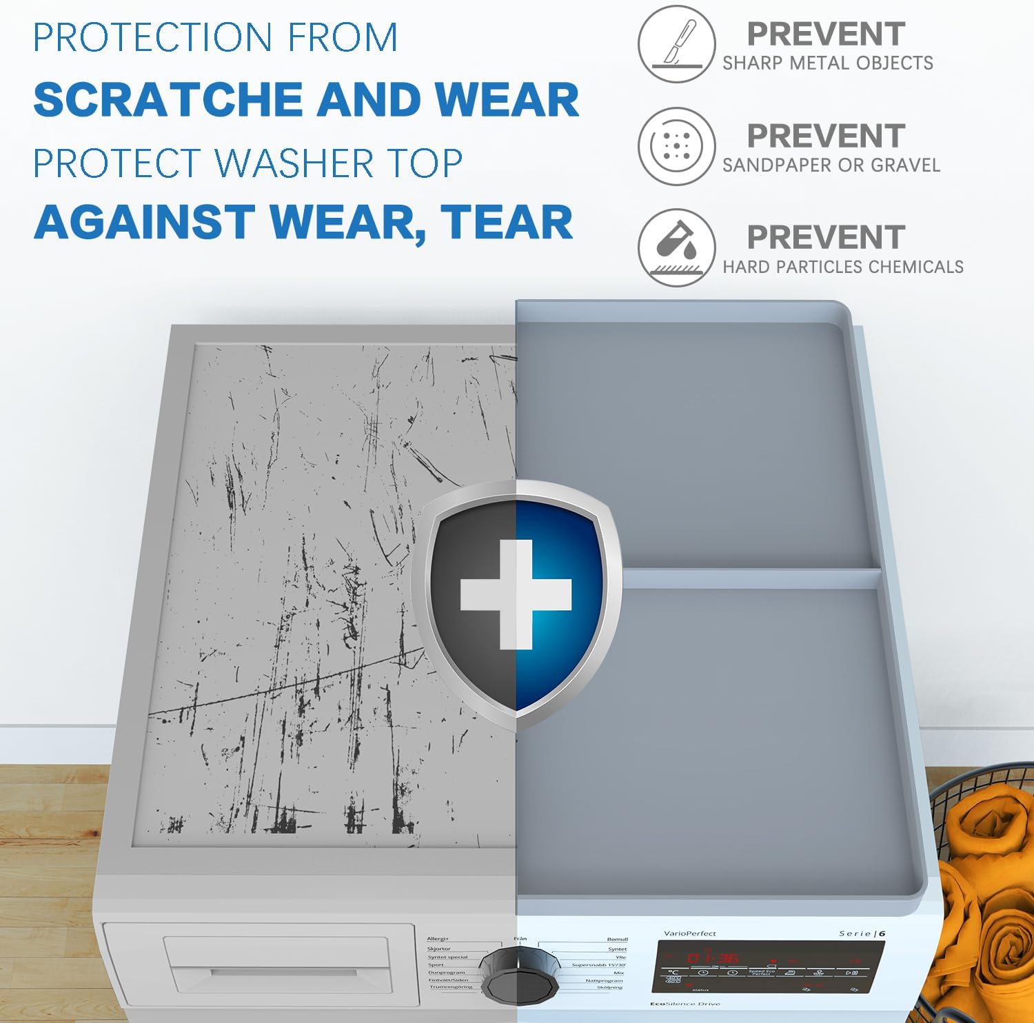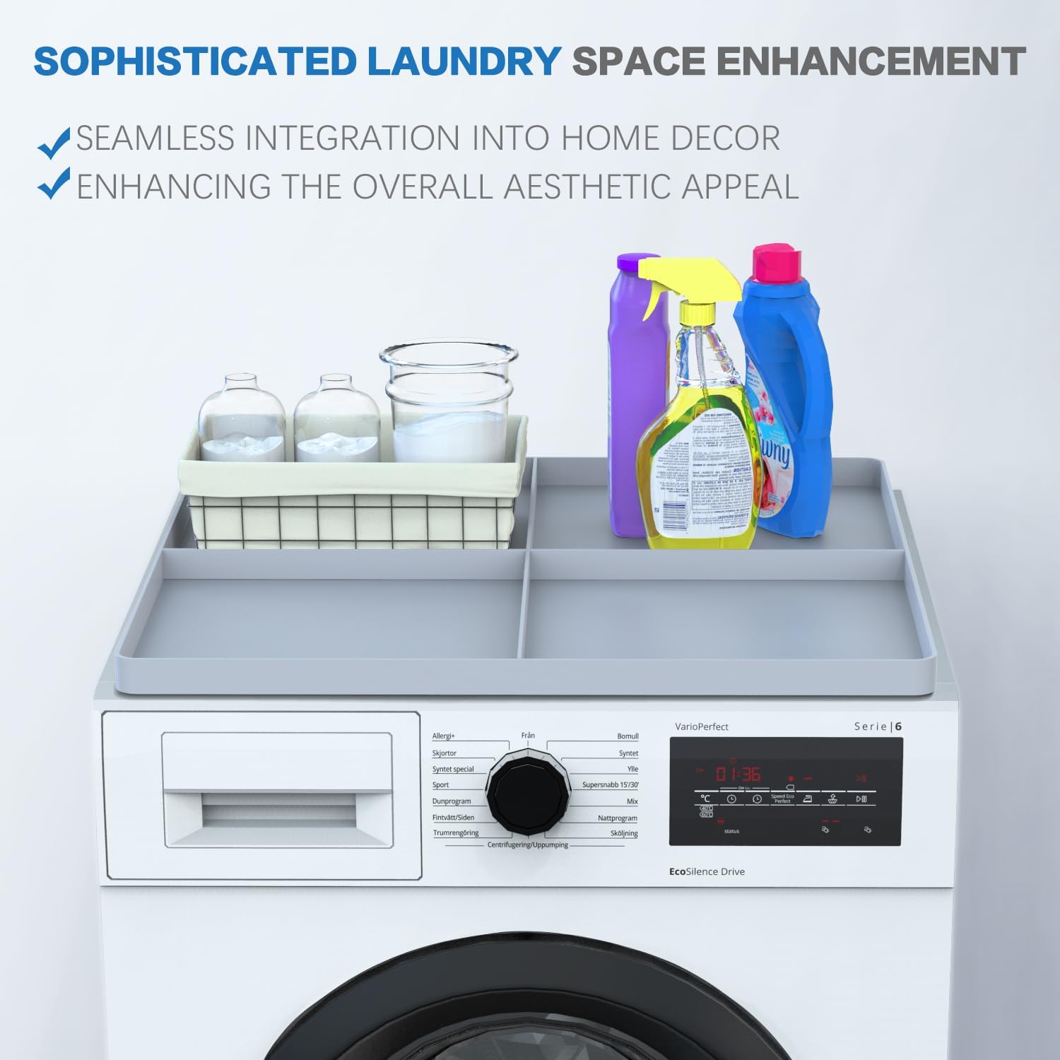 Multipurpose Silicone Mat: 1 pcs gray protector covers. Our silicone mat is designed to be a versatile solution for organizing laundry essentials while also protecting the appearance of your washing machine. A perfect silicone mat for washer and dryer top protector, the mat maximizes space efficiency in your laundry room while keeping everything neatly organized.