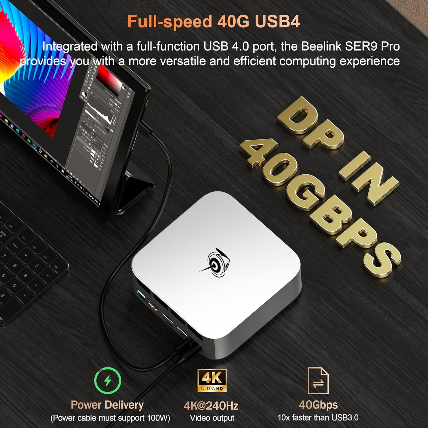 【Silent & Versatile Connectivity】 Beelink SER9 Ultra-quiet cooling (32 dB low decibel) + dual built-in speakers. Wi-Fi 6 (2.4 Gbps), Bluetooth 5.2, and USB4 (40Gbps) ensure stable connections. adapts to office, streaming, smart home, and entertainment setups