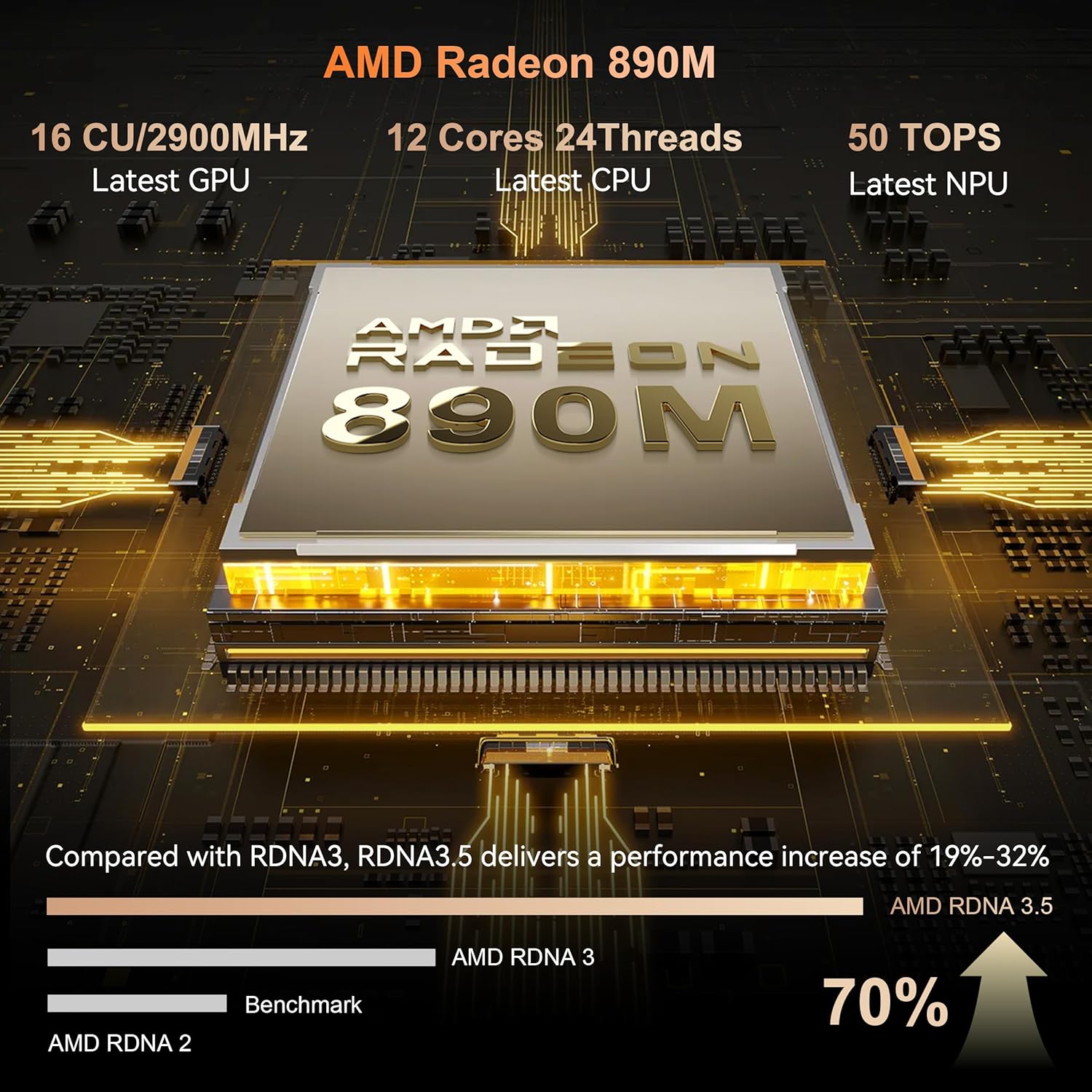 【4K 240Hz Triple-Display Gaming】 AMD Radeon 890M GPU (RDNA 3.5 architecture, 19%-32% performance boost) paired with 32GB LPDDR5X 8000MHz RAM delivers smooth AAA gaming: Black Myth: Wukong (98-143 FPS), CS:GO (150-264 FPS). Triple-display output via HDMI/DP/USB4 ensures immersive visuals
