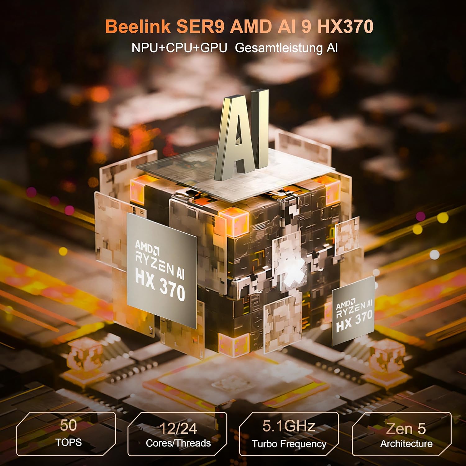 【 AI Performance, Fully Upgraded】Beelink SER9 Pro Mini PC Equipped with the AMD Ryzen AI 9 HX 370 processor (Zen5 architecture, 12 cores/24 threads, up to 5.1GHz), featuring 50% more CPU cores and 50% expanded L3 cache for seamless multitasking, 3D rendering, and AI training