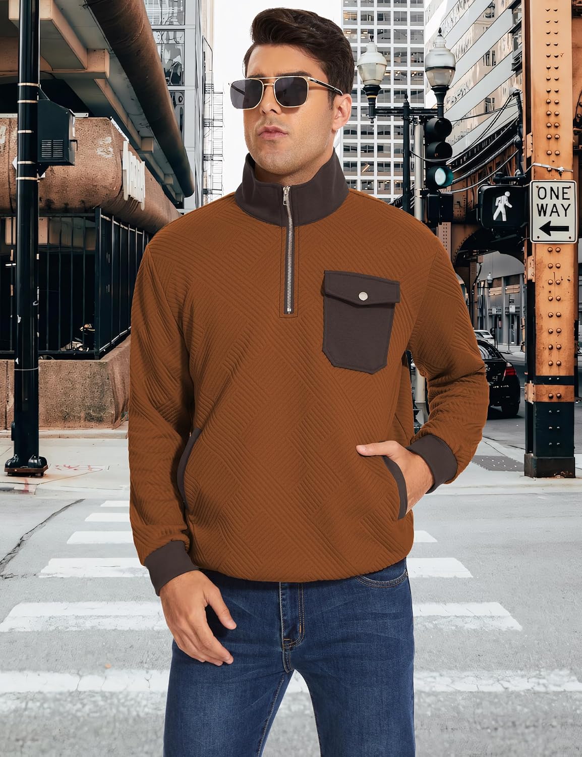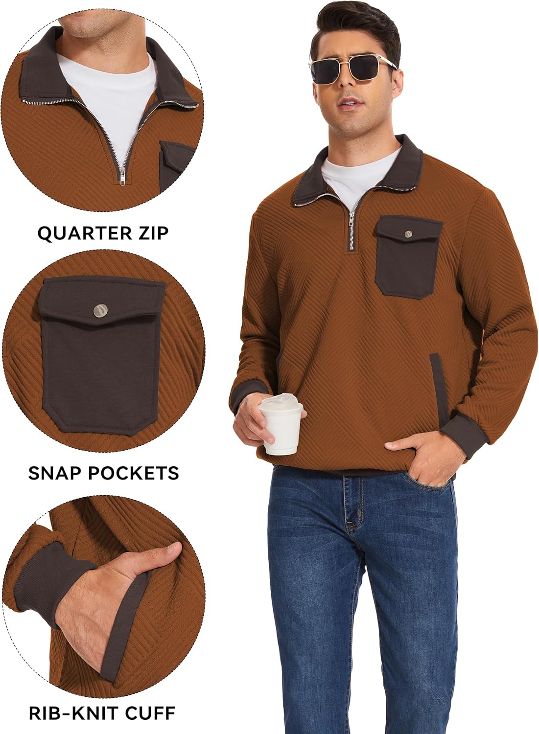 【Design】:Mens 1/4 zip pullover features a modern geometric pattern, combined with multi-functional snap pocket and quarter-zip design, making it ideal for both casual outings and formal events. The stand collar adds a touch of refinement, while the two side pockets provide convenient storage for keys, phones, wallets, and other small items.