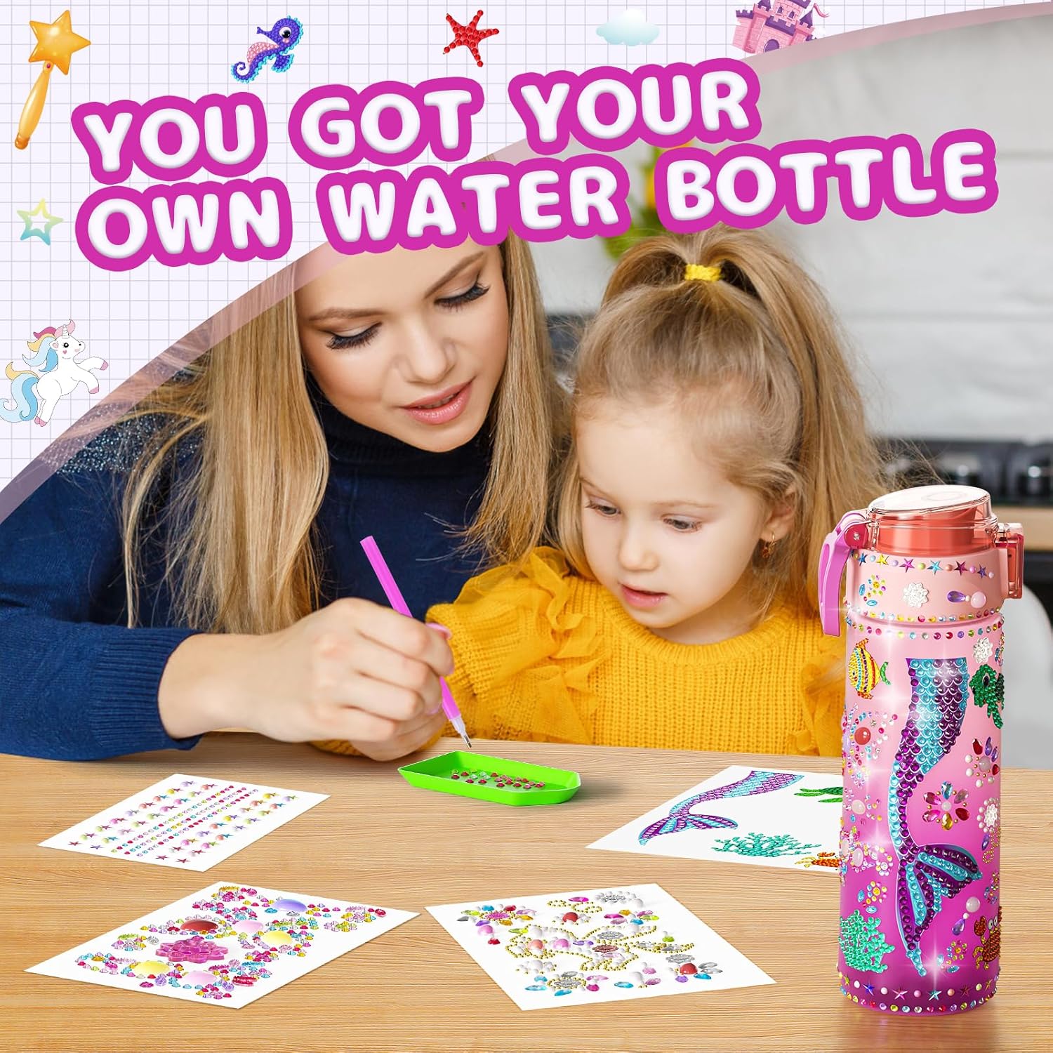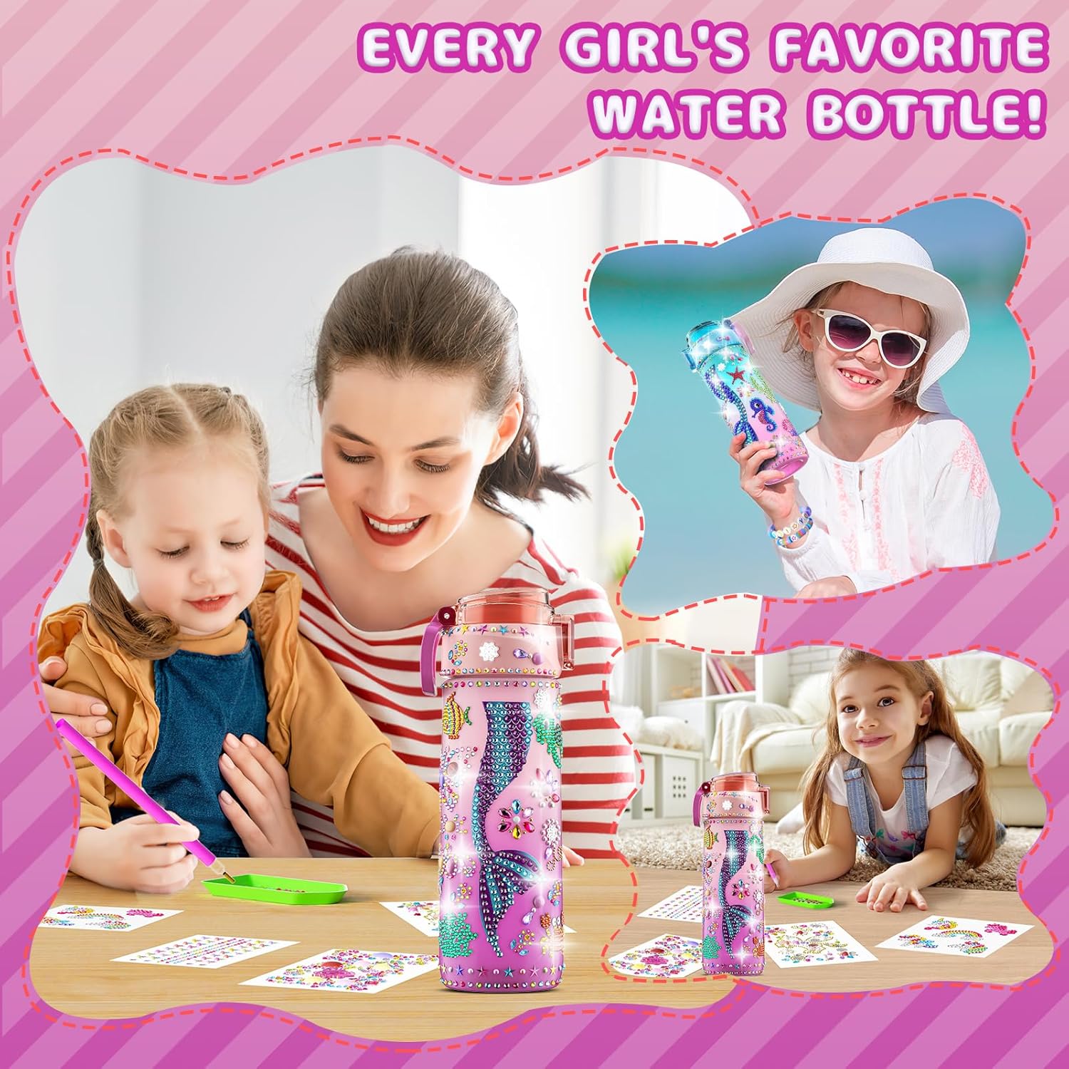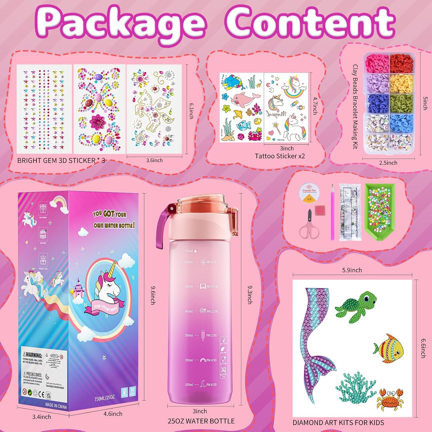 ??‍♀️ Mermaid Tails Painting Crafts: Multiple popular kits stimulate kids' endless creativity and sense of achievement: 1*Mermaid Theme DIY Diamond Gem Arts and Crafts Kit for girls aged 4-12 (including 5 patterns), 1*Clay Beads Bracelet Making Kit, 4* Vibrant and Sparkling 3D Diamond Stickers, and 2* Tattoo Stickers. Decorate your own water bottle is attractive toys for 6+ year old girl. Every girl can easily make unique mermaid water bottle has in their mind!