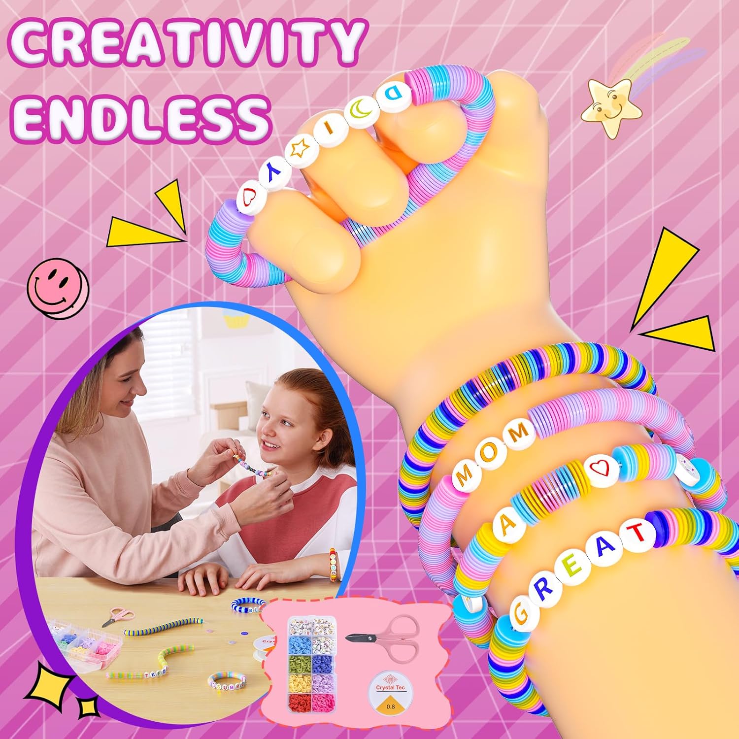 ??DIY Clay Beads Bracelet Making Kit: This friendship bracelet kit includes everything a beginner needs to start making beautiful bracelets, including more than 1200 pcs flat polymer clay beads and 140 pcs charms kit, equipped with roll stretchy strings and scissors. Kids can create more than 10 bracelets. It's suitable crafts for girls aged 6-8-10-12 to cultivating hands-on ability and concentration.