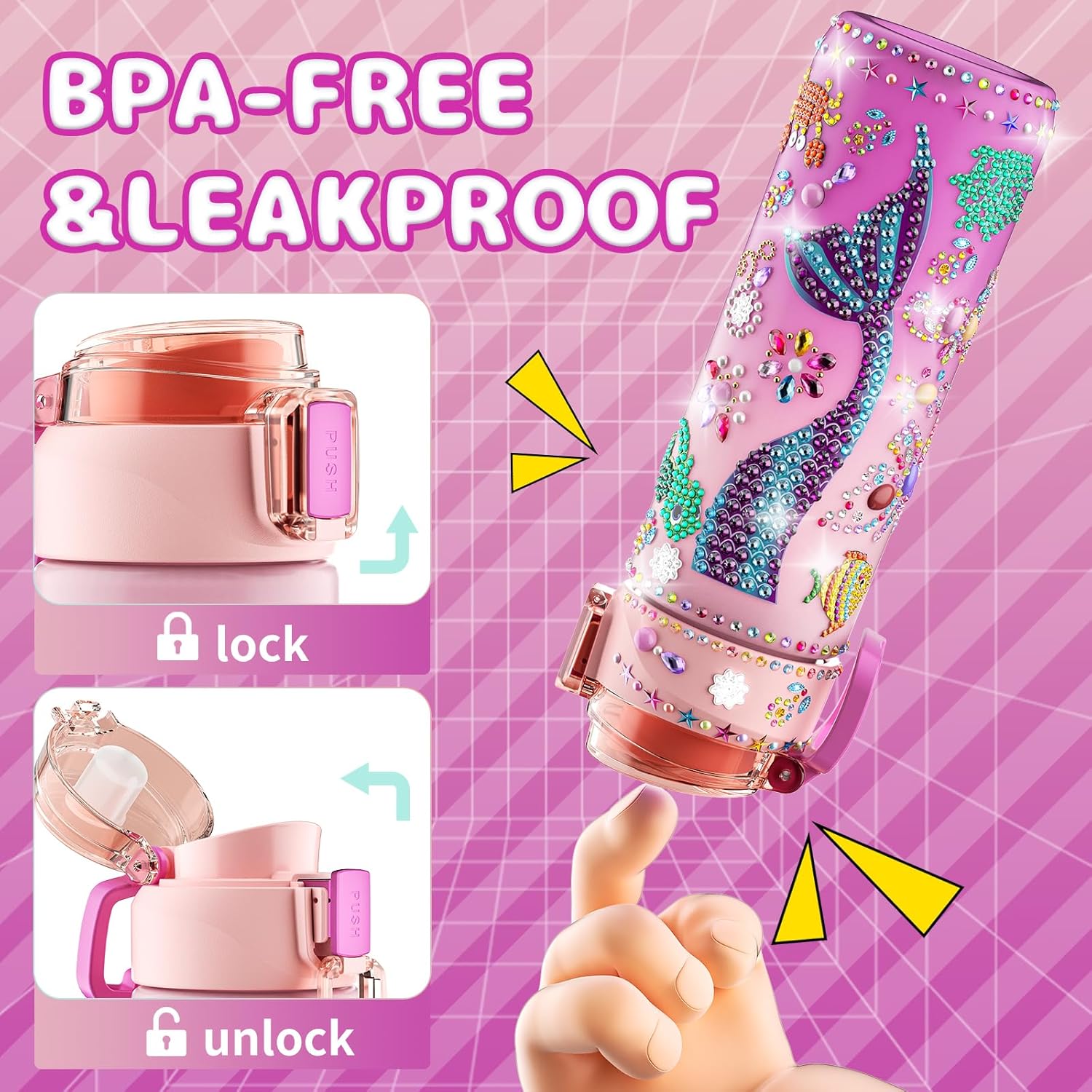 ✔️Designed for Children: BOOH bottle designed with One-Click Open Lock, 360° Leakproof, Wide Mouth for cleaning easily, Fast-flow Technology help kids get water quicker while prevent choking water. The Lightweight material and integrated Silicone Hook help children carry around and outdoor use. The personalized gorgeous diamond decorations water bottle with time marker can motivate kids stay hydrated whole day!