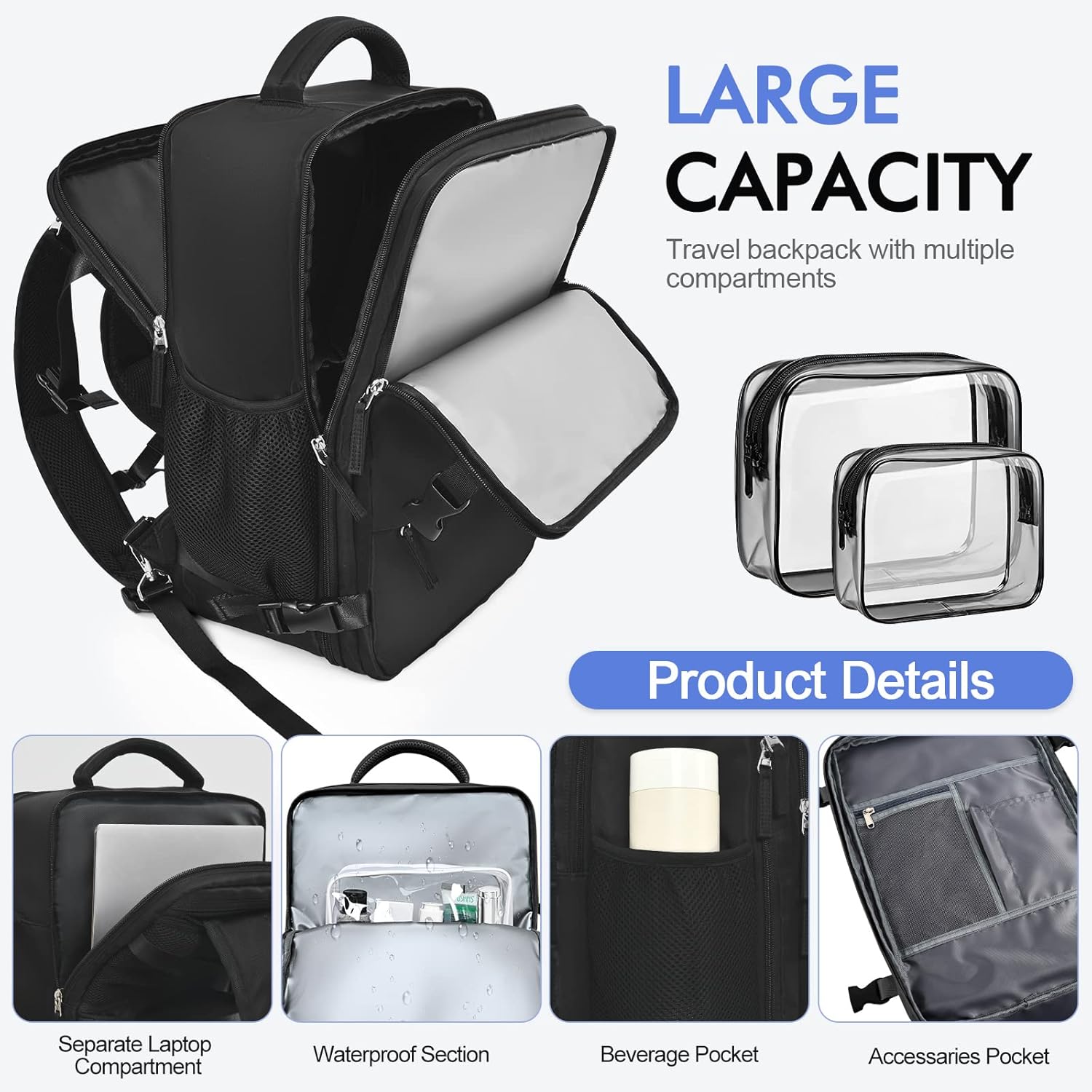 【Large Capacity and Multi Pockets】Carry on backpack with large storage capacity and two extra toiletry bags. Multiple zippered pockets give you plenty of storage space, including a front pocket, waterproof section, main compartment, separate laptop compartment, and anti-theft pocket on the back. In addition, this traveling backpack also has a mesh slip-in pocket with elastic closure on the left side for a bottle or an umbrella