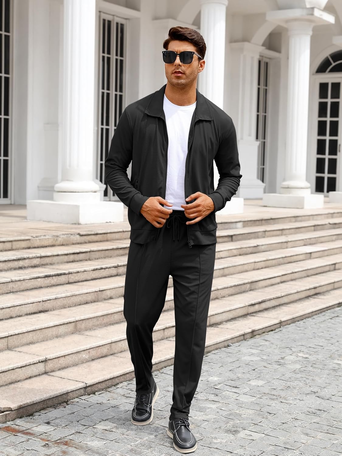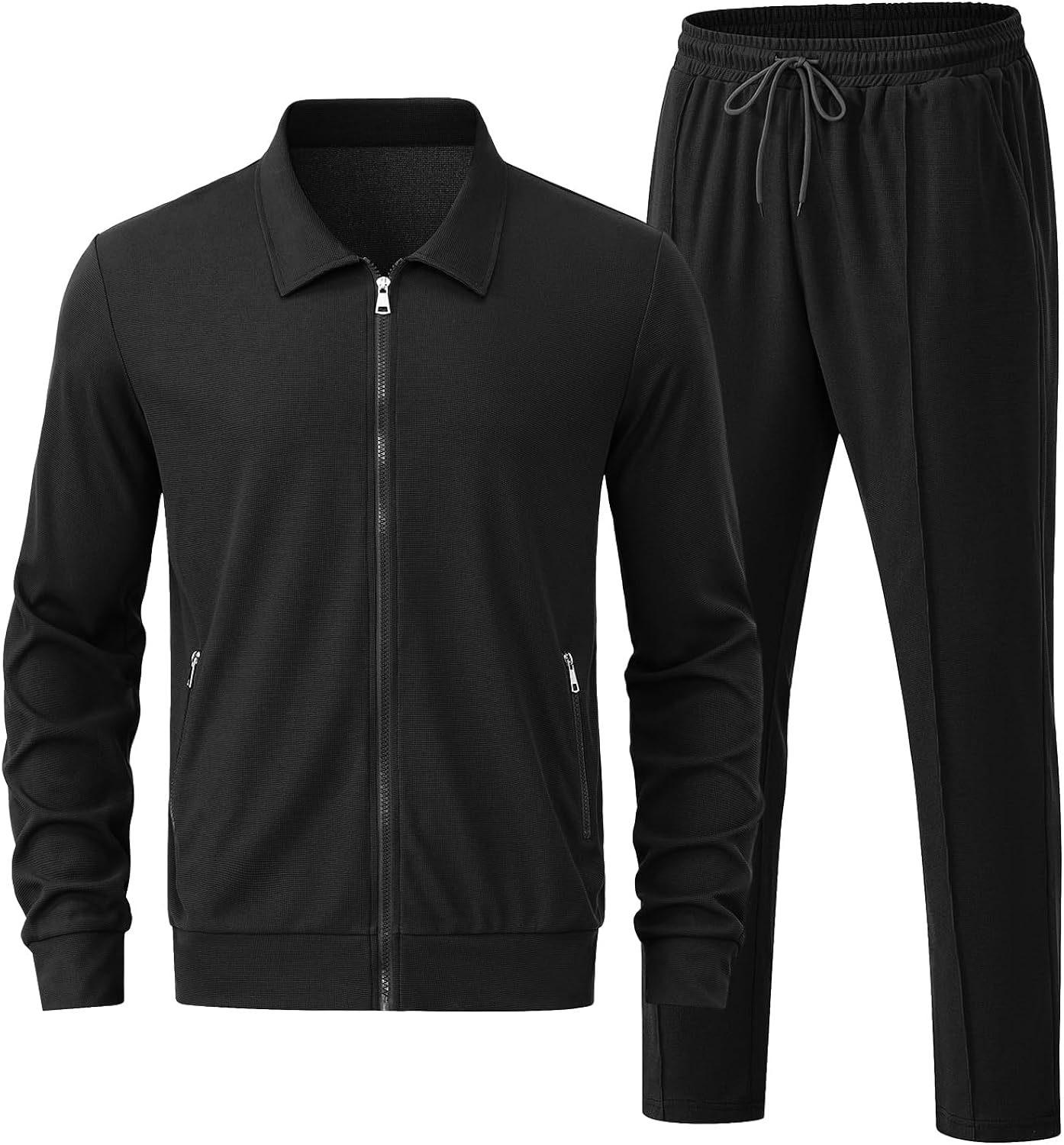【Features and design】: The Mens tracksuit set consist of a full zip jacket and straight-leg pants. The top jacket features front full zip closure, lapel collar and 2 big slant pockets for your takeaway essentials. The straight standard fit casual pants features elastic waist with adjustable drawstring.