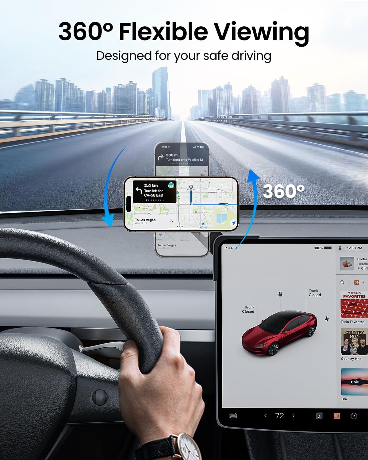 With a flexible 360° ball joint, the New Model Y Juniper phone holder can easy switching between horizontal and vertical modes. The adjustable knob allows you to position your phone on the 45° angle of the screen for a better view and driving experience.