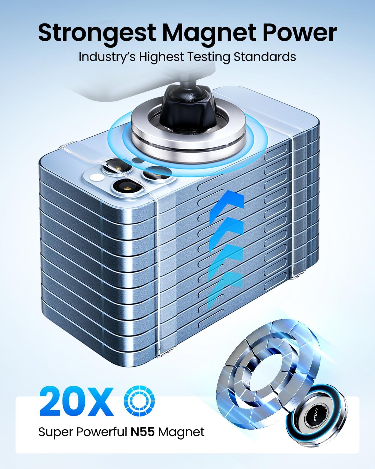 Built in 20 strong N55 magnets, the phone holder can hold up to 10 iPhone Pro Maxes. It keeps your phone securely in place, even on bumpy roads or sharp turns. Say goodbye to phone drops while driving.