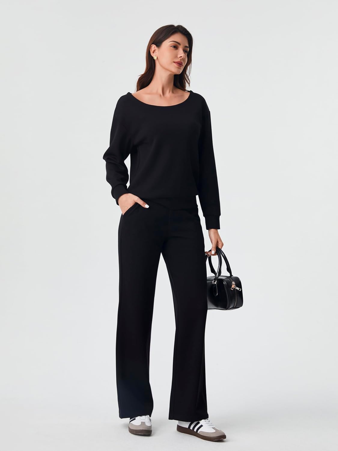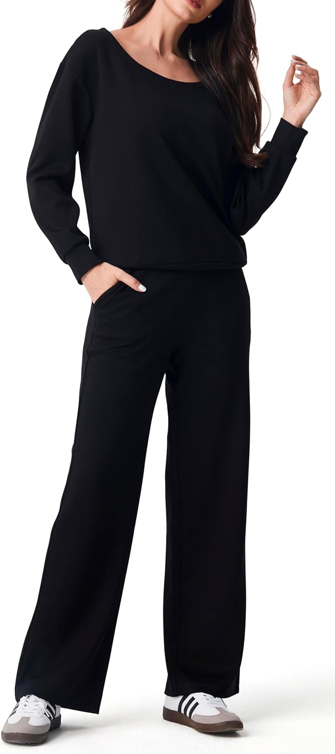 Sets Features: These matching sets includes a long-sleeve top and wide-leg pants. The sweatpants have 2 side pockets and a high elastic waistband, available in 29” or 31” lengths. They ensure a relaxed fit and can be dressed up or down with ease