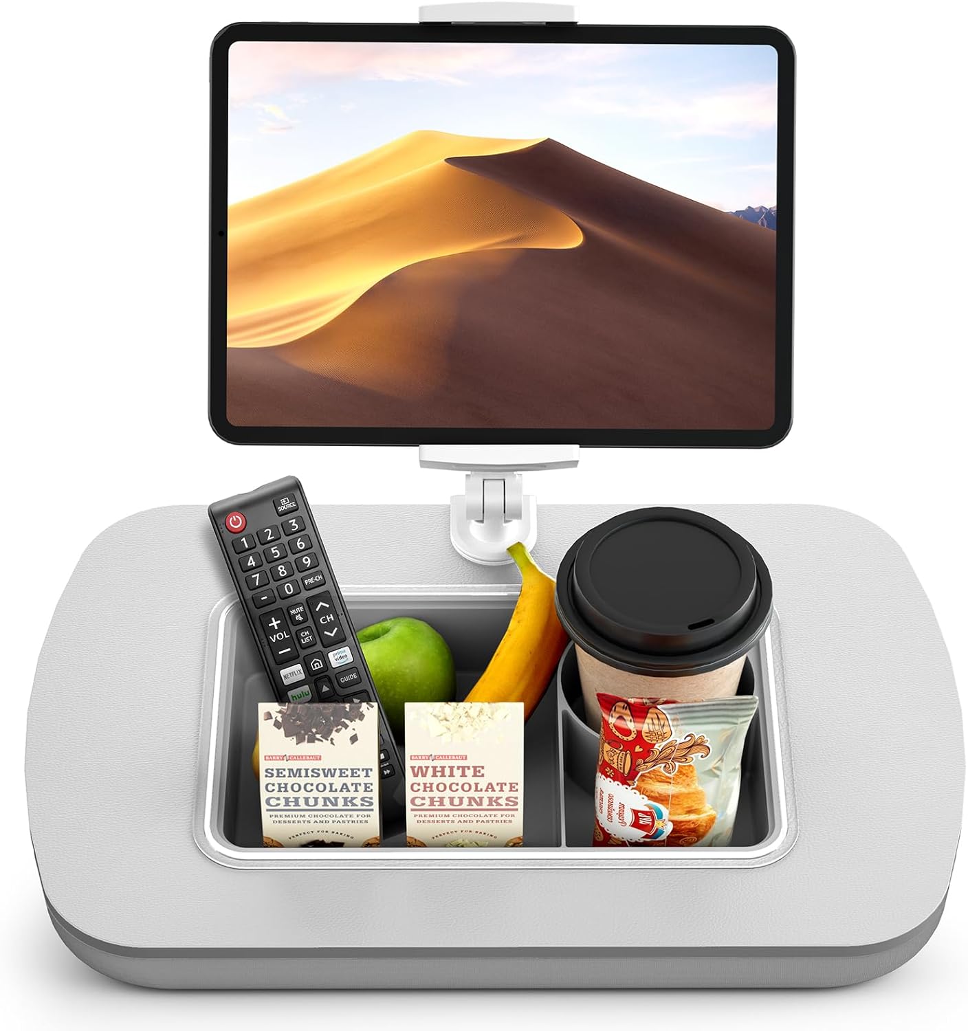 【Versatile Storage】 The removable silicone snack bowl is easy to clean and features three compartments for snacks, drinks, or small items like remotes and glasses.