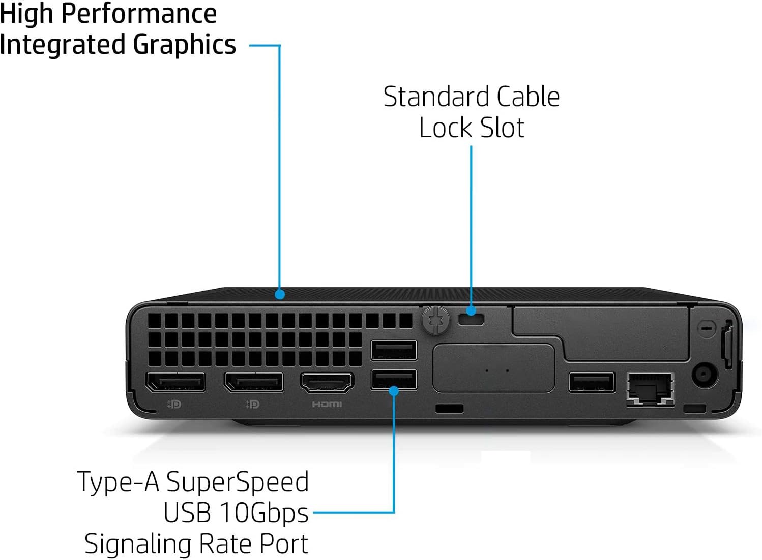 ■ Wireless ■ Wi-Fi 6 (2x2) and Bluetooth. Front: 1 headset connector; 1 SuperSpeed USB Type-A 10Gbps signaling rate; 1 SuperSpeed USB Type-A 10Gbps signaling rate (charging); 1 SuperSpeed USB Type-C 20Gbps signaling rate. Rear:1 external antenna connector; 1 power connector; 1 RJ-45; 3 SuperSpeed USB Type-A 10Gbps signaling rate; 2 DisplayPort 1.4; 1 HDMI 2.1.