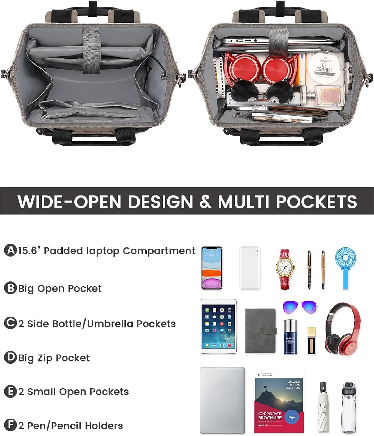 Multi-Pockets Design: The internal multi-pockets design makes the laptop backpack more organized. This women backpack has enough organization to keep your stuff nice.Each pocket can be expanded to a considerable size,This laptop backpack enough to hold 15.6-inch laptop, 10.5-inch iPad, mobile phone, wallet, water bottle, umbrella, textbook and so on