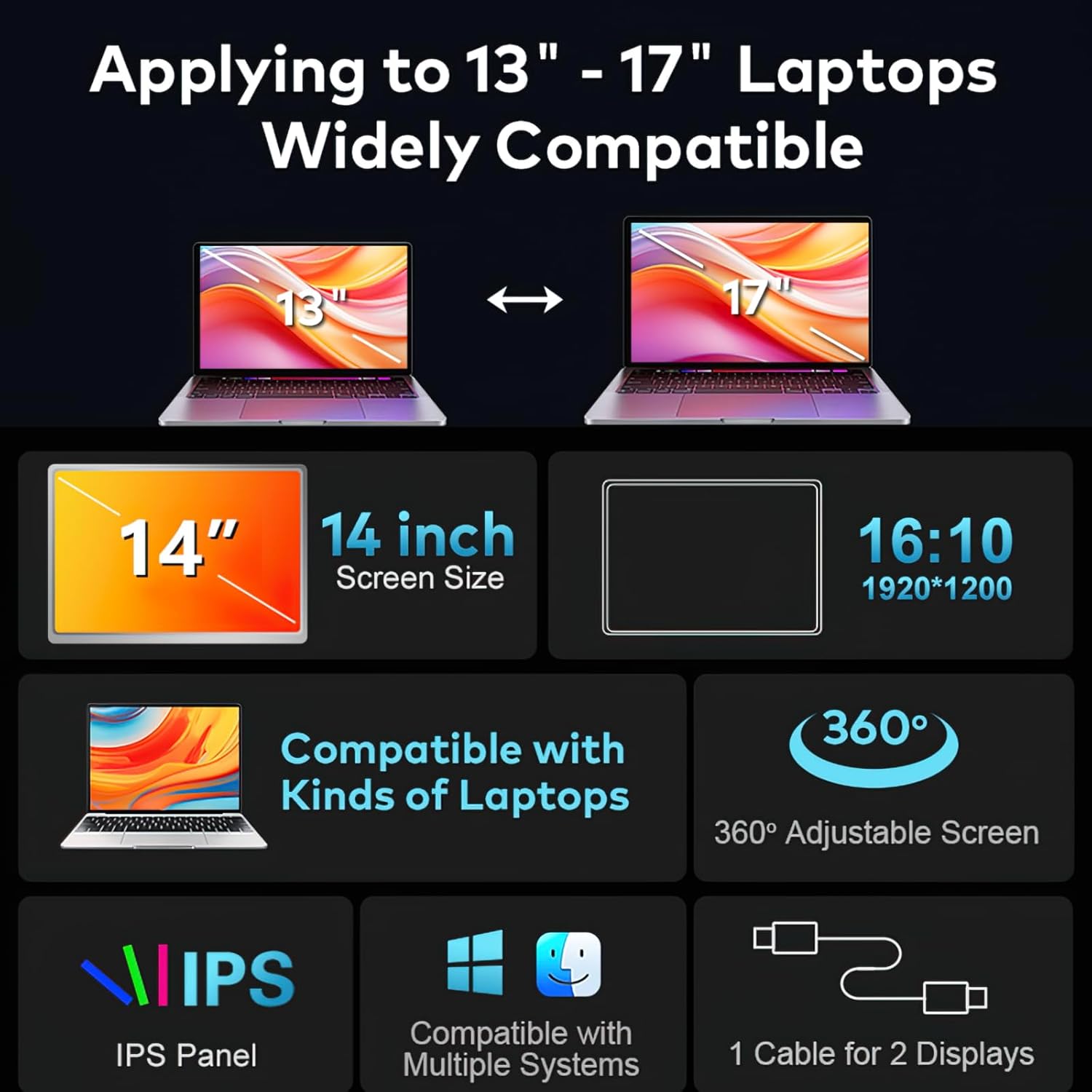 Stunning FHD 1080P Display: Enjoy crisp and vibrant visuals on the 14-inch Full HD (1920x1080) IPS screen with 235° viewing angle. With a 16:9 aspect ratio and 45% NTSC, this portable monitor ensures clear images and rich colors, perfect for multitasking, conferences, and content creation.