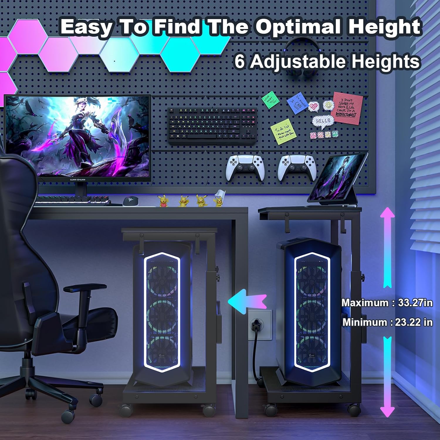 Height Adjustable Pc Tower Stand: Features unique manual height adjustment ranging from 23.23"-33.27" to speed up heat dissipation and improve overall computer performance, overall dimensions 25.19 inches long, 13.78 inches wide, Allows you to store the tower under or next to a desk, Supports most computer towers on the market including full-tower ATX case