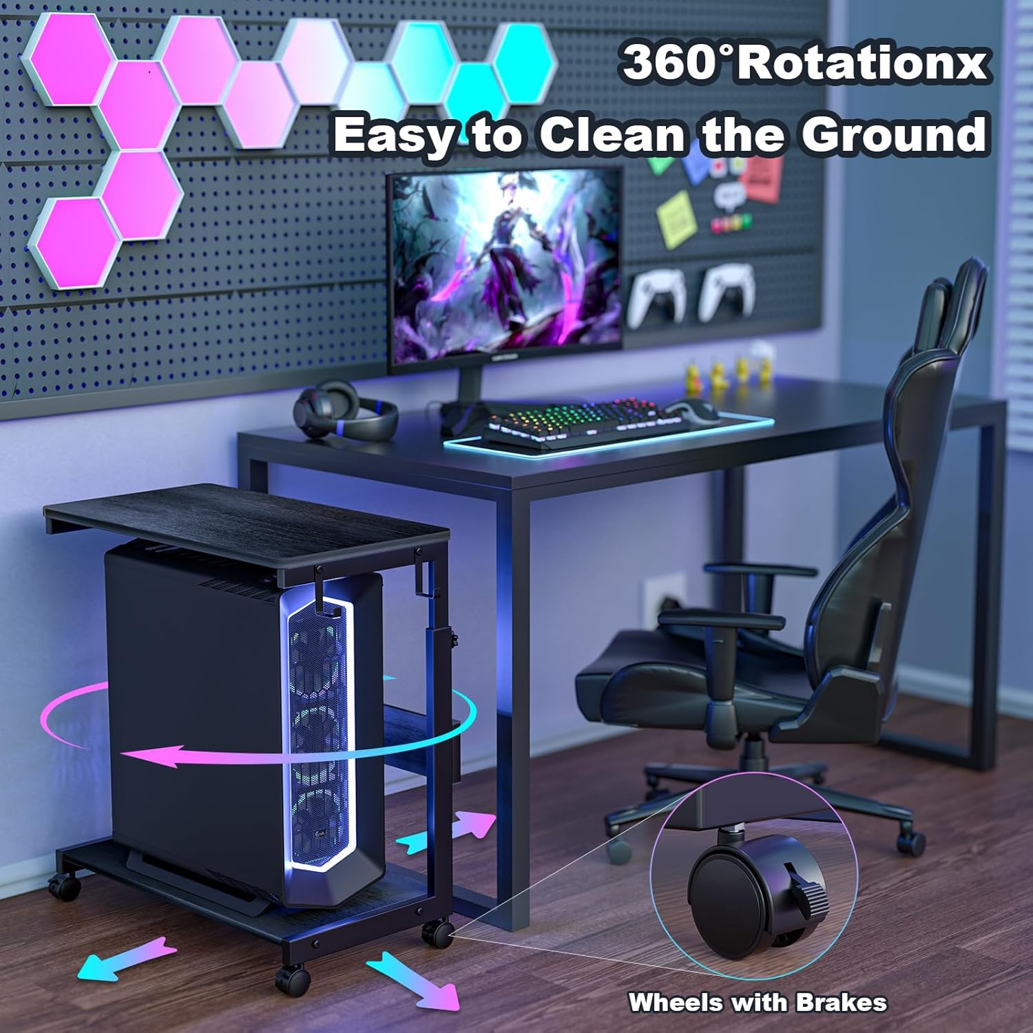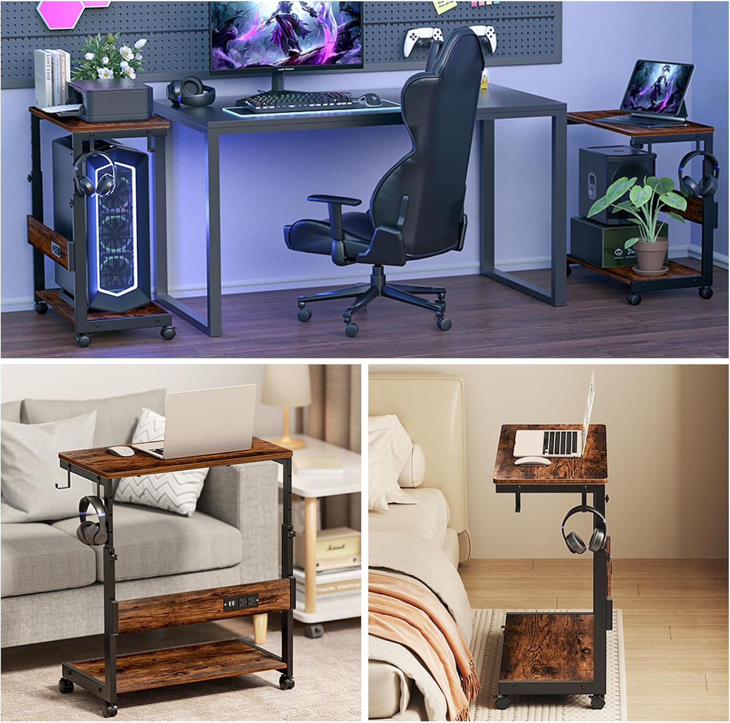Pc Tower Stand With Charging Station: This Mobile PC Standing with dual 120V/12A outlets and dual USB ports can power your laptop, smartphone, printer, tablet or any electronic device. Great for keeping an organized workspace. Plus, the PC Tower Rack doubles as a side table to provide additional power for your desk lamp
