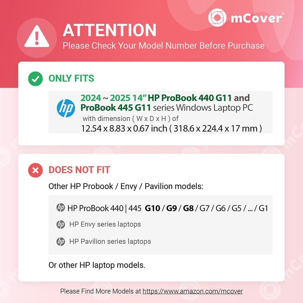 Designed to perfectly fit the 2024 - 2025 14" HP ProBook 440 / 445 G11 series Windows Notebook PC with dimension of 12.54 x 8.83 x 0.67 inch ( 318.6 x 224.4 x 17 mm )