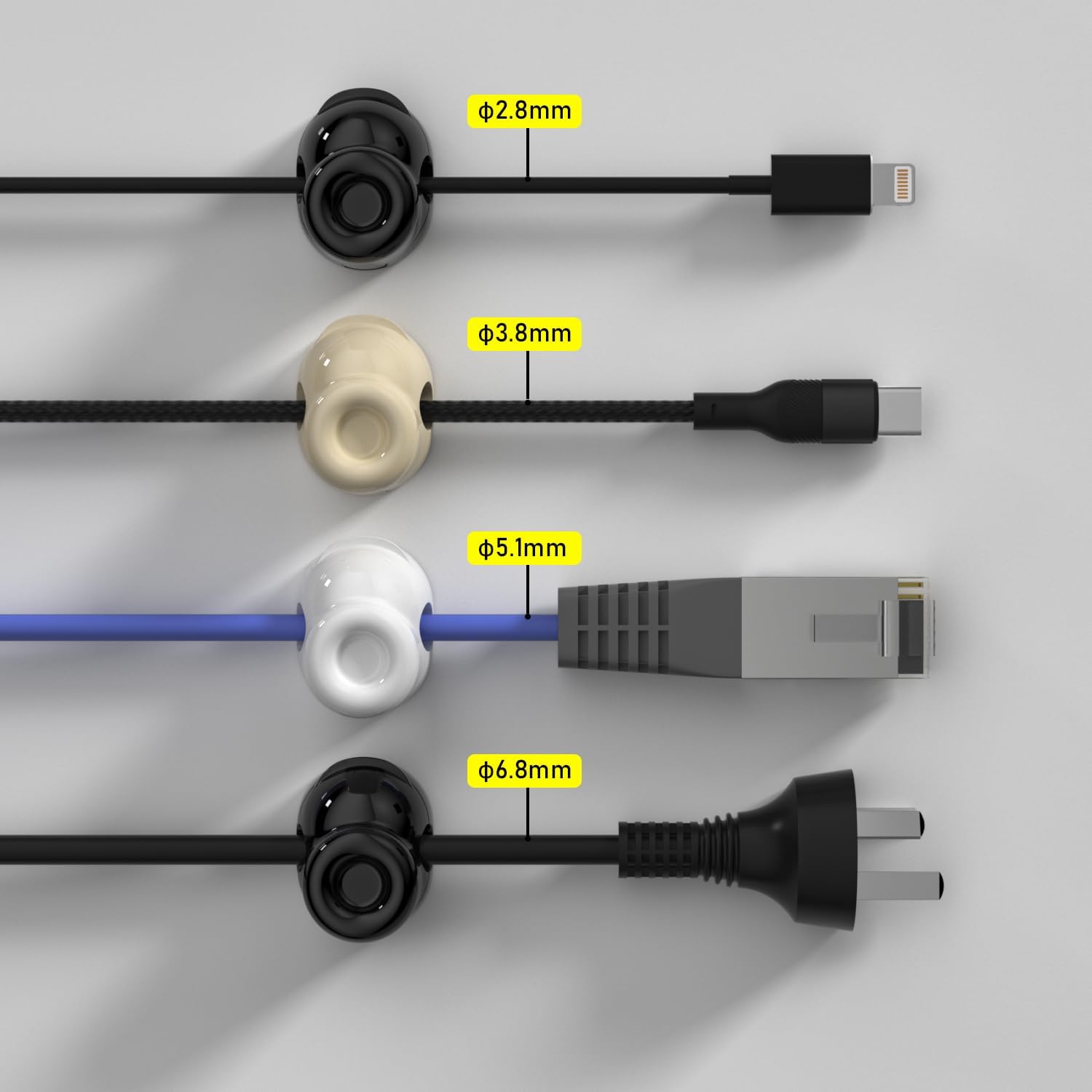 Hold Most Cords: Diameter of about 0.3 inch (7.5mm) allows to hold most cords, such as Type-C charger cords, lightning cords, HDMI cords, USB cables, PC Notebook power wires, network wires, mouse cords, keyboard cables, headphone cords