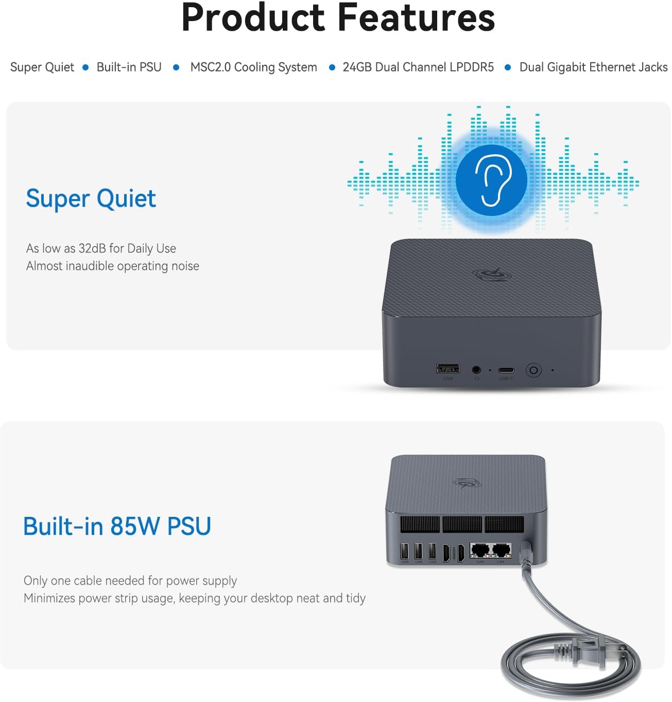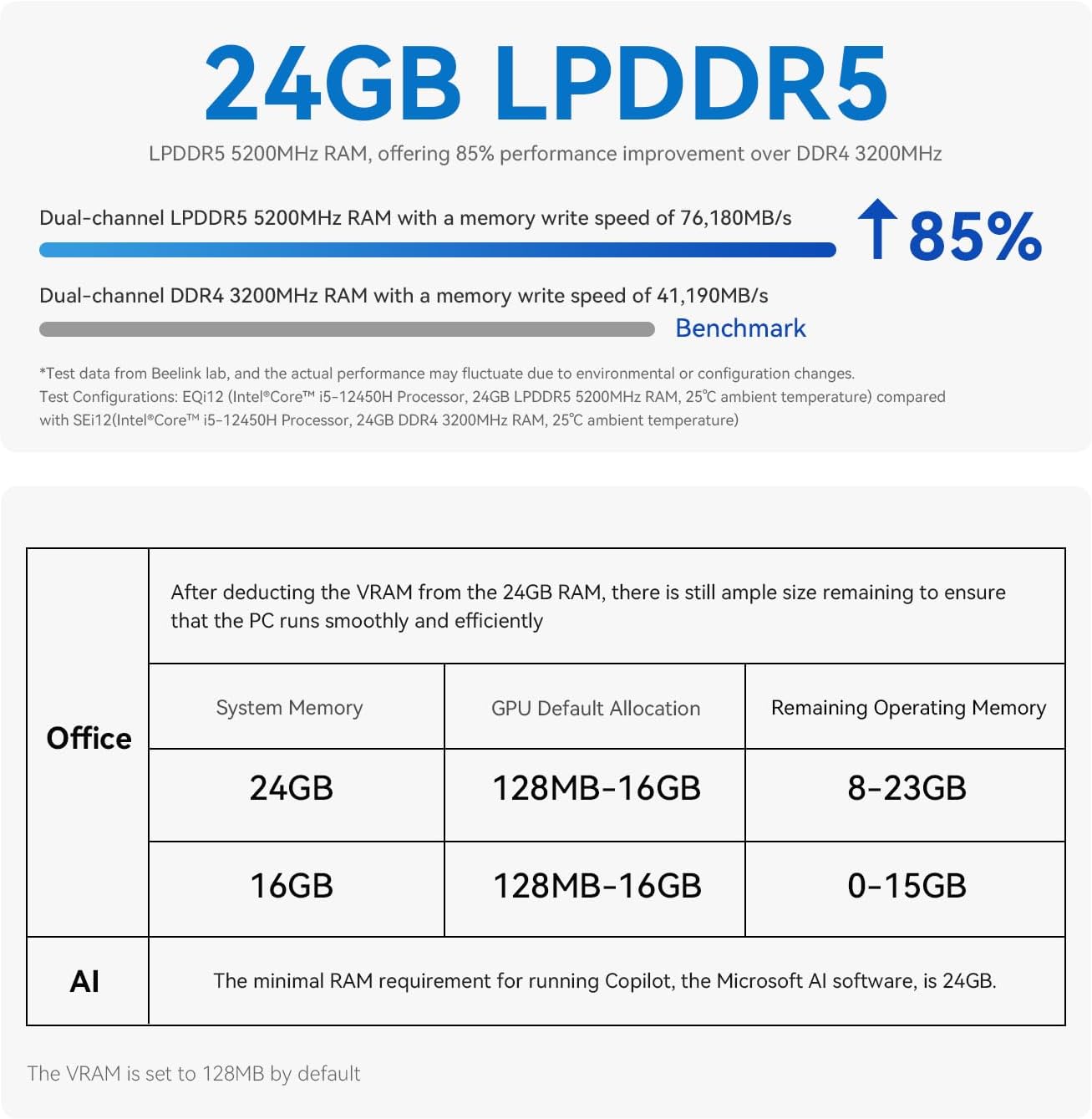 【High capacity & Expansion Options】The 12450h mini computers is equipped with 24GB (12GB*2) LPDDR5 5200MHz RAM.The transfer rate of LPDDR5 is 35% higher than that of LPDDR4,ensuring smooth system operation.Software startup and data processing are faster.Install 500GB M.2 PCIe 4.0 2280 SSD,support dual-channel M.2 PCIe 4.0,up to 4TB (2 x 2TB, not included),high-speed storage and large capacity enable you to switch back and forth between more applications without stalling.