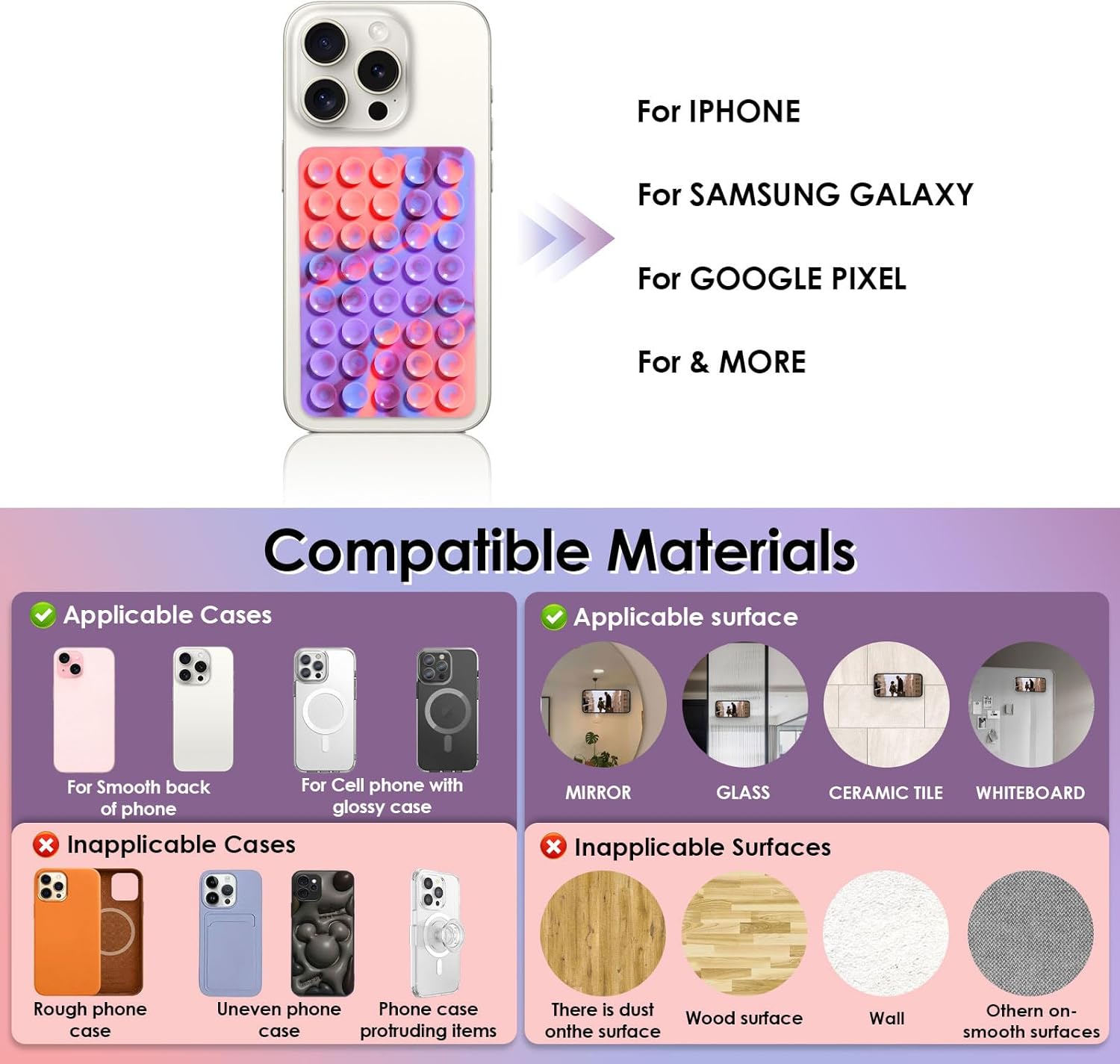 Wide Compatibility: This dual silicone suction cup phone stand is compatible with most iPhone, Samsung Galaxy, LG, and Android devices ranging from 6.1 to 7.2 inches. It offers stable support in both portrait and landscape orientations. The ultra-thin, soft silicone material and foldable design also make it a perfect choice for use as a desktop phone stand