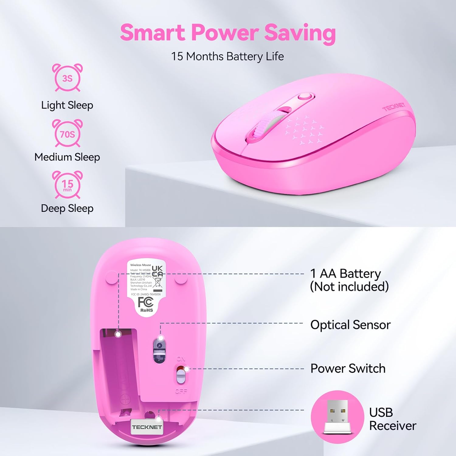 【Easy to Use Laptop Mouse】 TECKNET travel mouse comes with a nano receiver (stored IN the mouse). 2.4GHz wireless technology ensures reliable connectivity up to 49ft. 3 adjustable DPI levels (1600/1200/800) to meet your different needs. Only need 1xAA battery (NOT included) to support up to 15 months battery life.