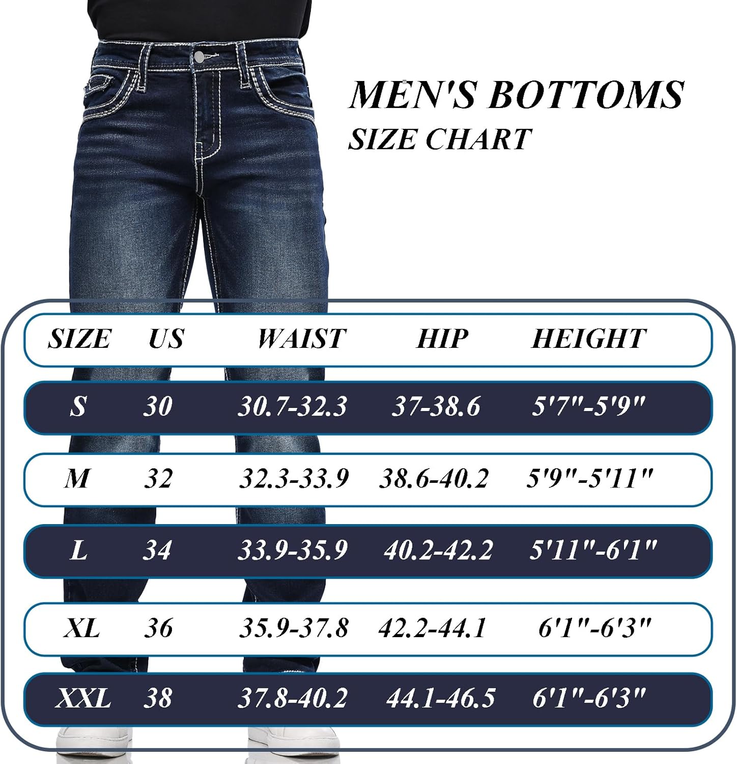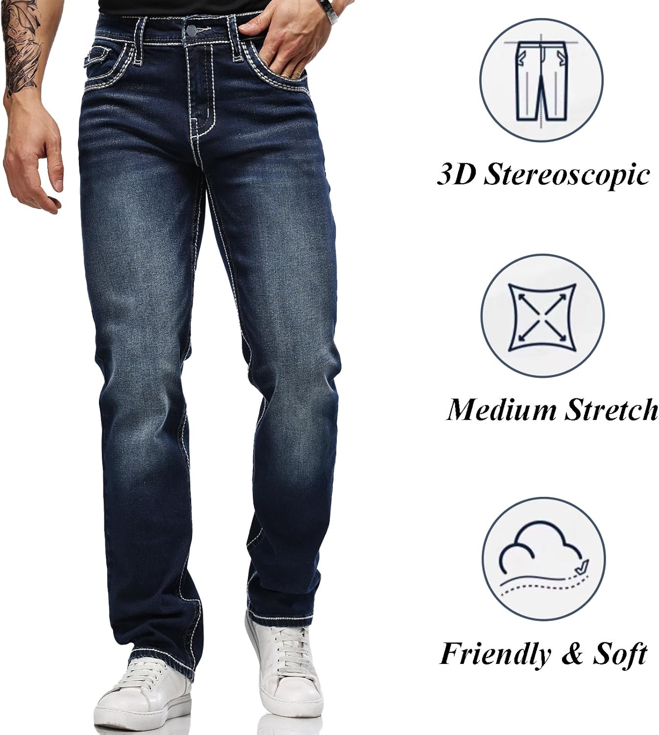 【PREMIUM FABRIC】The jeans for men are crafted from high-stretch denim and cotton blend materials (65.5% cotton, 33% polyester, 1.5% spandex), these jeans offer an incredibly soft touch and lasting comfort, ensuring that it remains comfortable for long periods of wear.