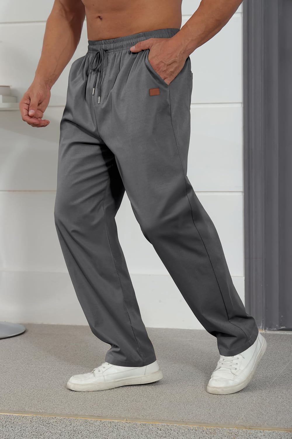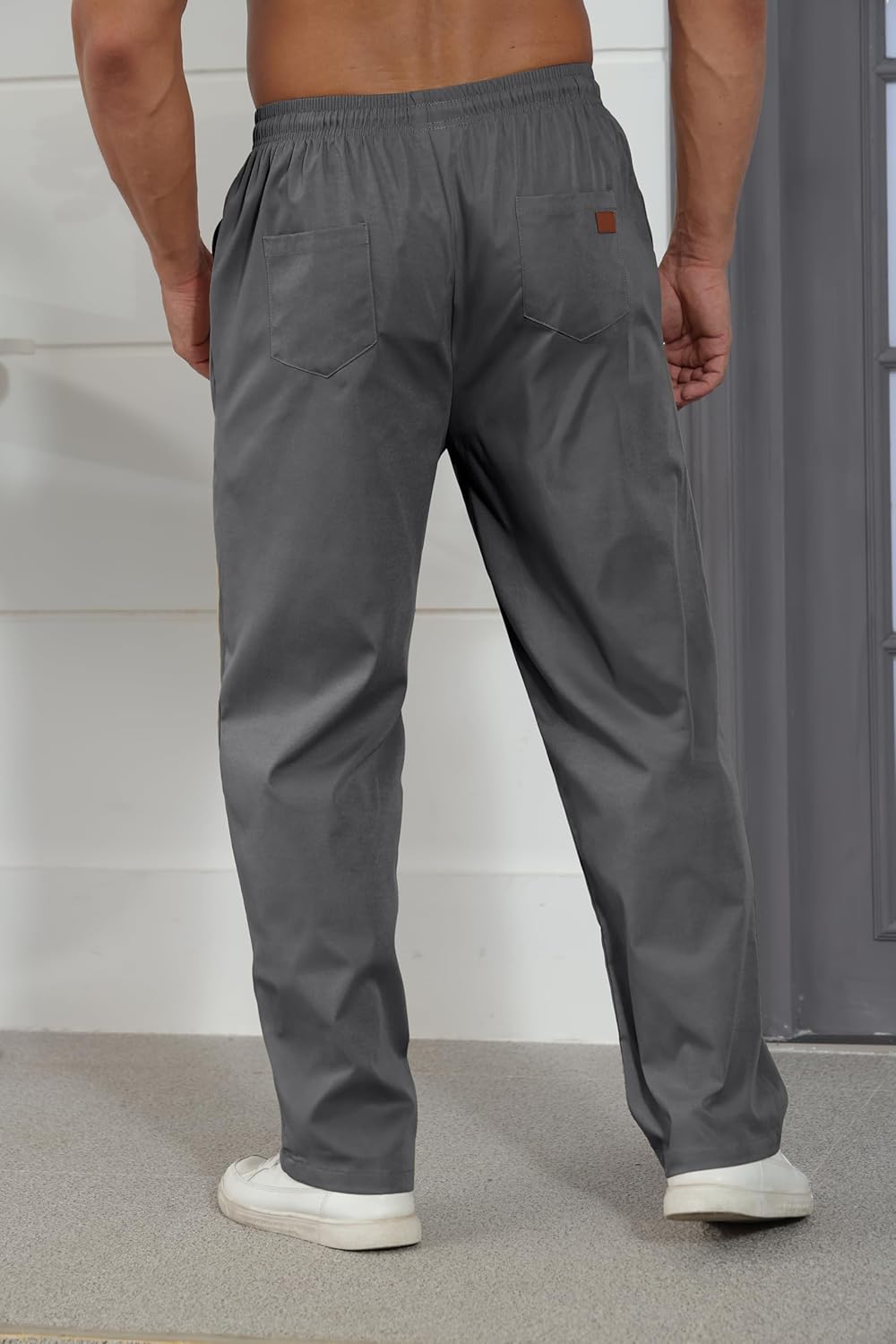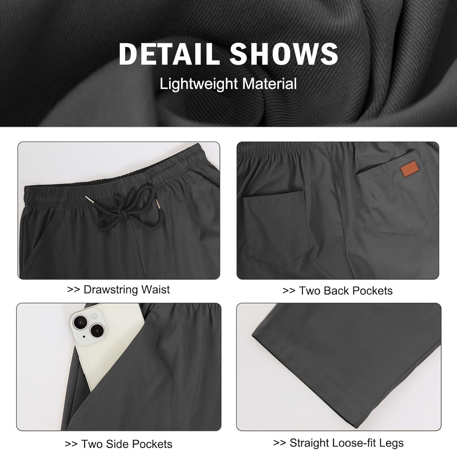 Features:Minimalistand fashionable versatile cargo pants,astic waistband with drawstring, 2 Three-Dimensional Leather Label(more eyecatching)beside the pocket, Four pockets (two in front,two in back), solid color, regular fit.