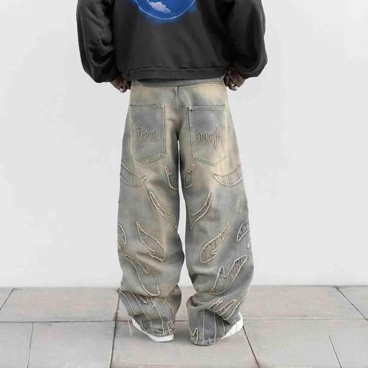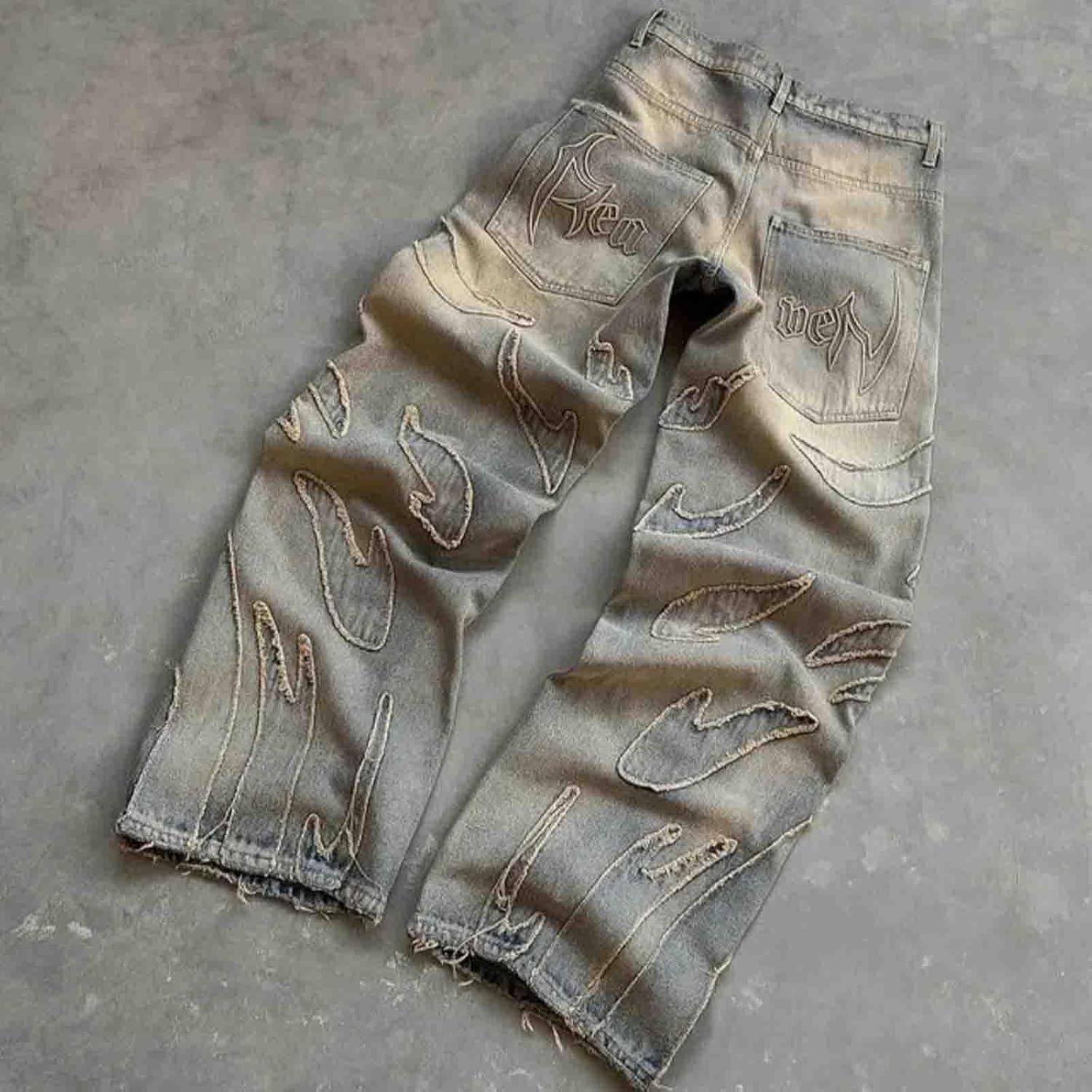 Multi functional design: Y2K jeans adopt a classic design, featuring loose and casual jeans. The Gothic flame stitched embroidery patterns on the side pockets and slanted top pockets enhance practicality.