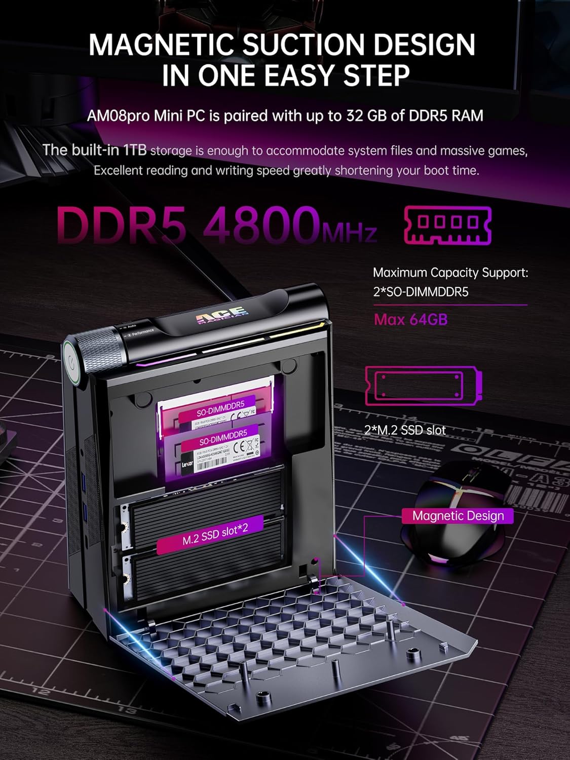 【Unique 3 Mode Design】AM08PRO Mini PC designed with 3 different modes (silent/auto/performance), better power saving through switch. Silent mode is suitable for watching movies and light office, auto mode is smooth for medium-sized office software like 3D viewing, and performance mode is perfect for gaming. AM08PRO has a unique vertical design (save space) and RGB breathing light effect.