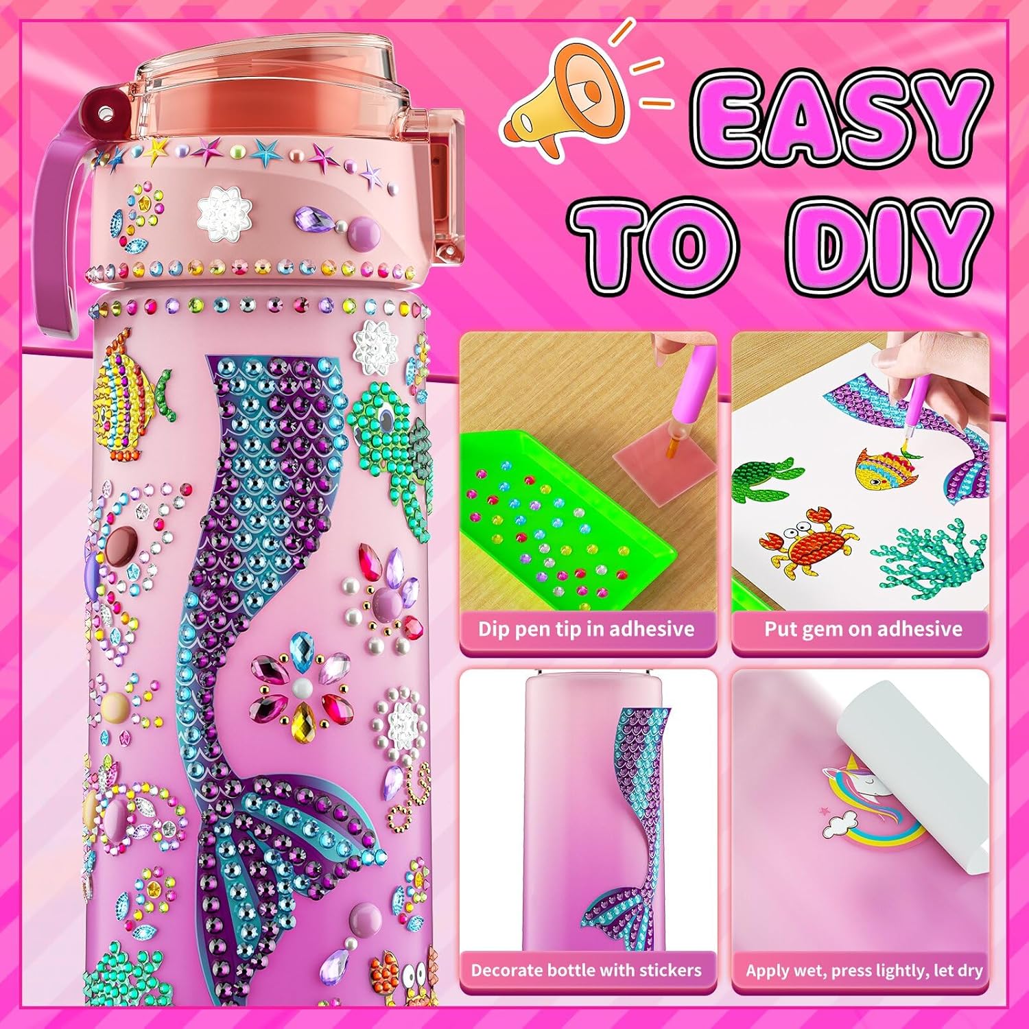 Fun Arts And Crafts For Kids: Our DIY Mermaid Painting Crafts includes: 25OZ Water Bottle x1, Tattoo Sticker x2, 3D Diamond Sticker x3, Clay Beads Bracelet Making Kit x1, Mermaid Theme Diamond Arts and Crafts Kit x1. DIY water bottles show unique creativity, convey emotions, cultivate manual skills, and bring pleasure and relaxation. Suitable for 6+ year old girls