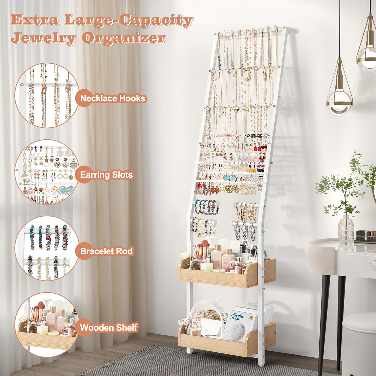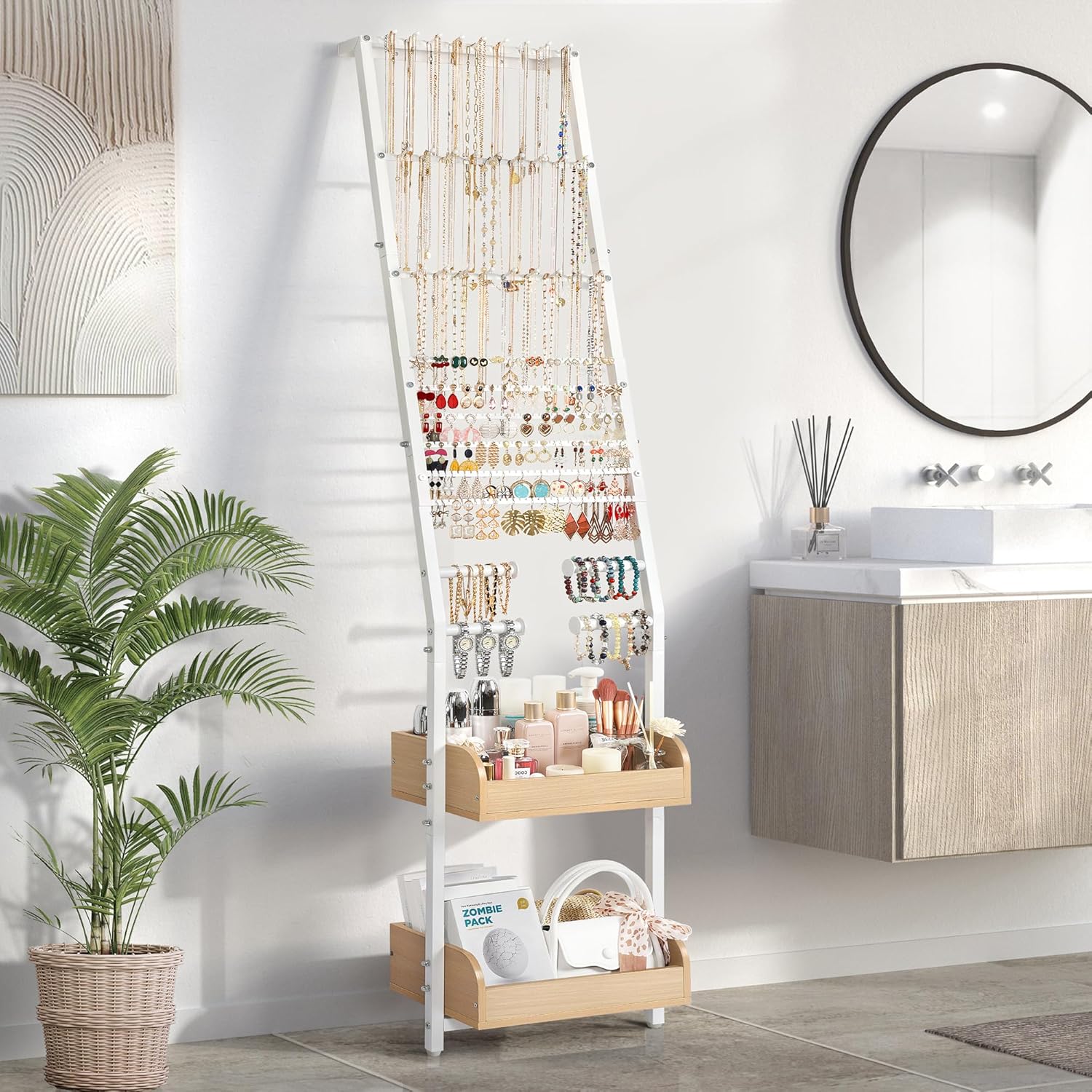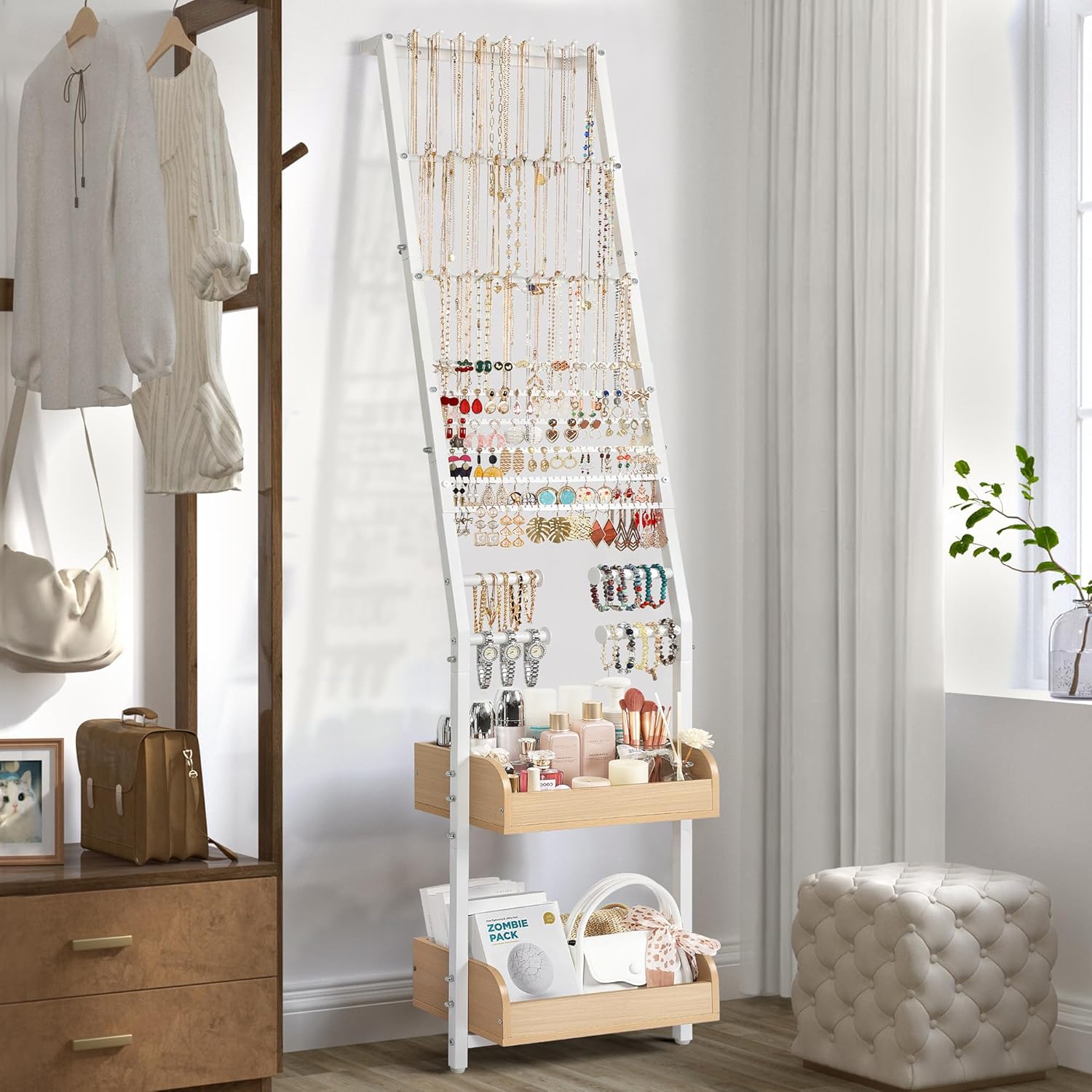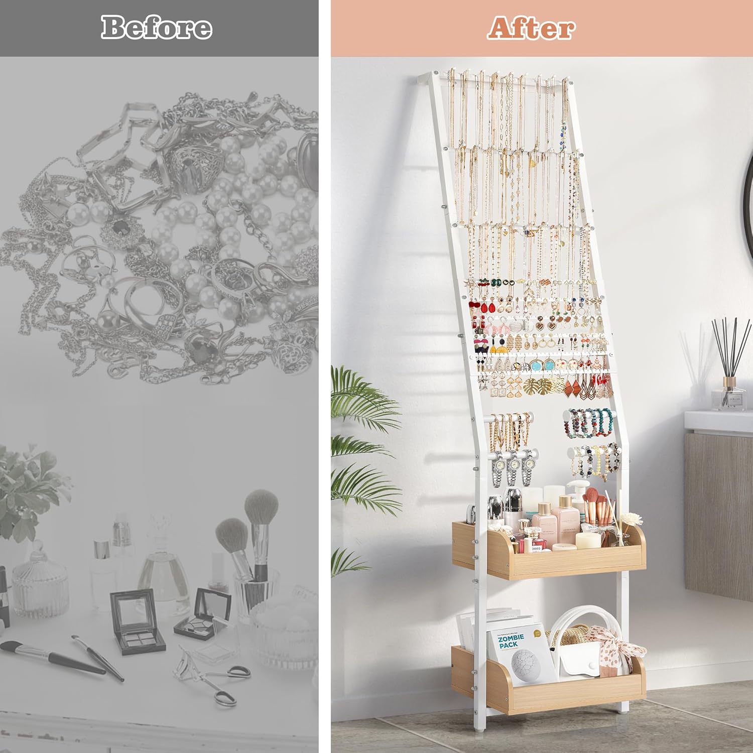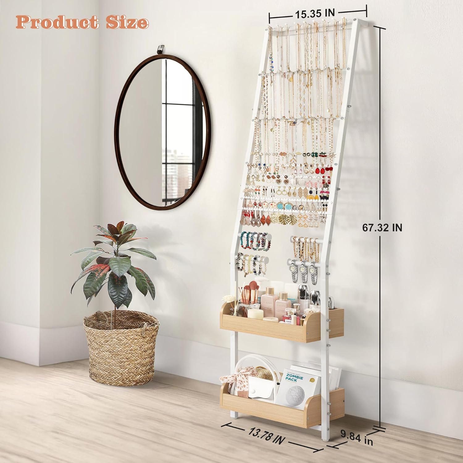 【67.3-Inch Floor Jewelry Stand with Large Wood Skincare Organizers Tray】A great jewelry storage stand, can place beside full-length mirror or wardrobe, especially ideal for the one who have huge amount of jewelry and cosmetics,capacity larger but light weight compared to bulky jewelry armoire or jewelry cabinet.