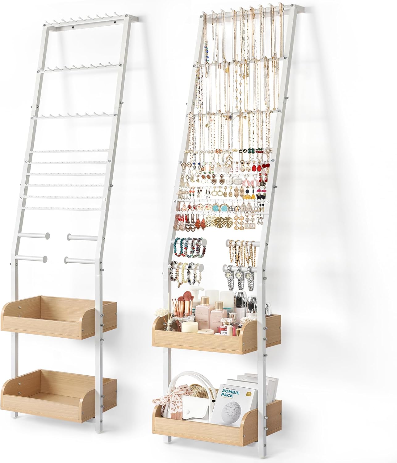 【Robust and Durable Jewelry Stand】This jewelry organizer is easy to clean and rust-resistant. Made of a high-end durable powder-coated metal frame and high-quality thickened easy-to-clean wooden boards, the earring holder organizer with necklace display ensures a long service life and is not easily damaged.