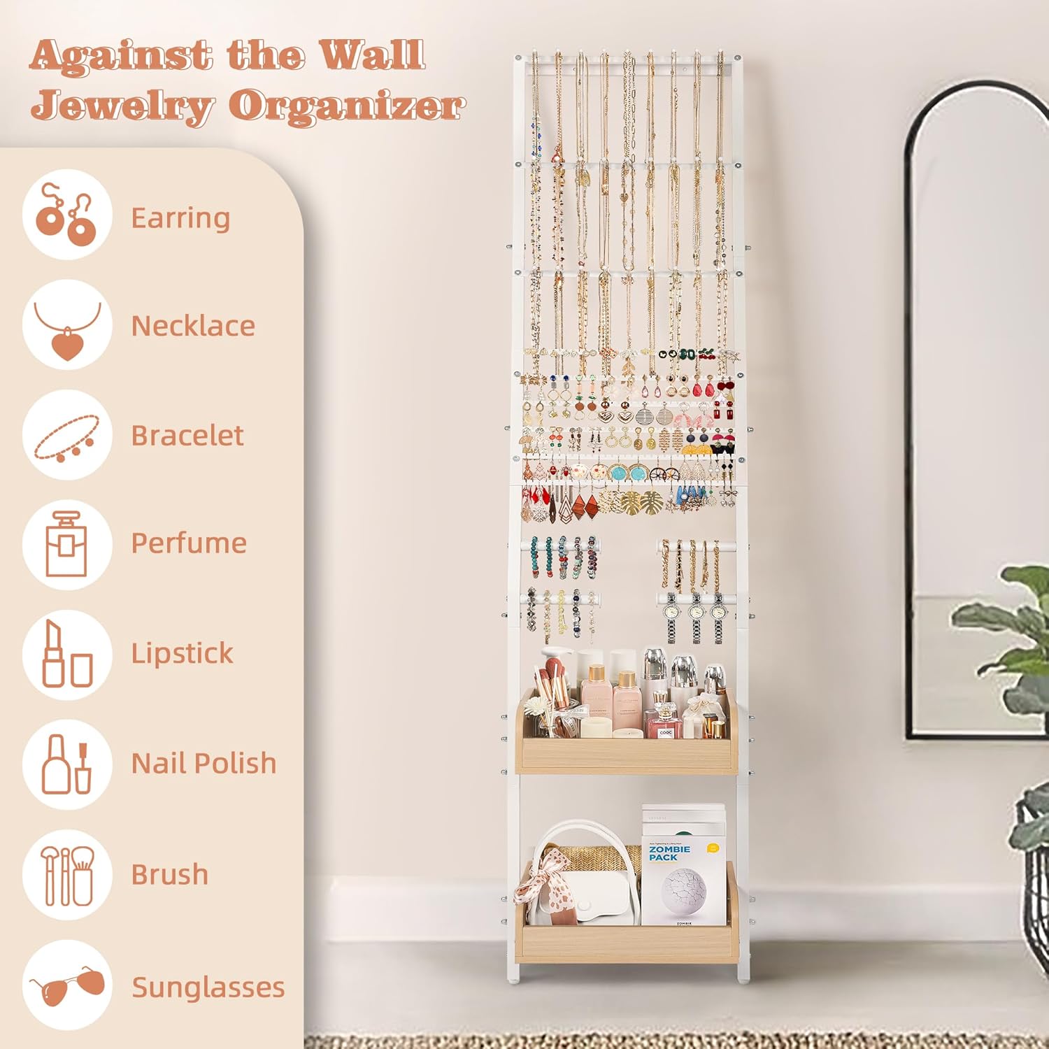 【Wall Jewelry Organizer】This uniquely designed jewelry display stands against the wall and can make full use of the wall space to display your jewelry in the best way. The wall jewelry organizer with floor-standing design effectively frees up your countertop space and keeps all your jewelry and skin care products in one place.