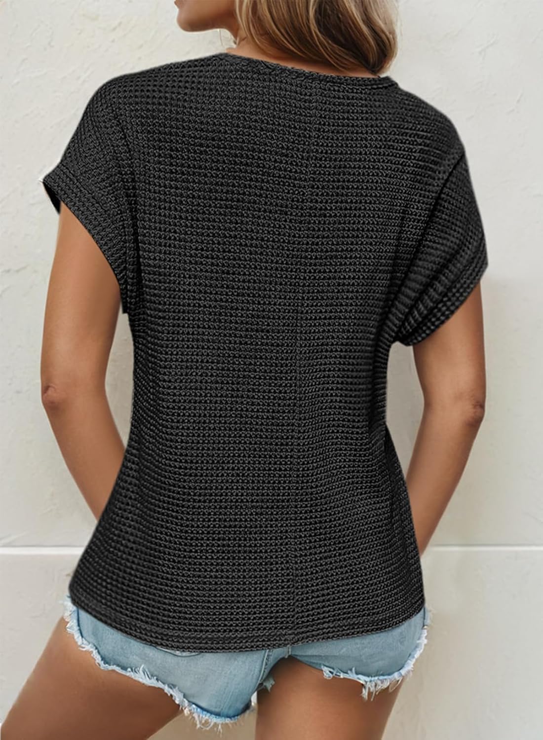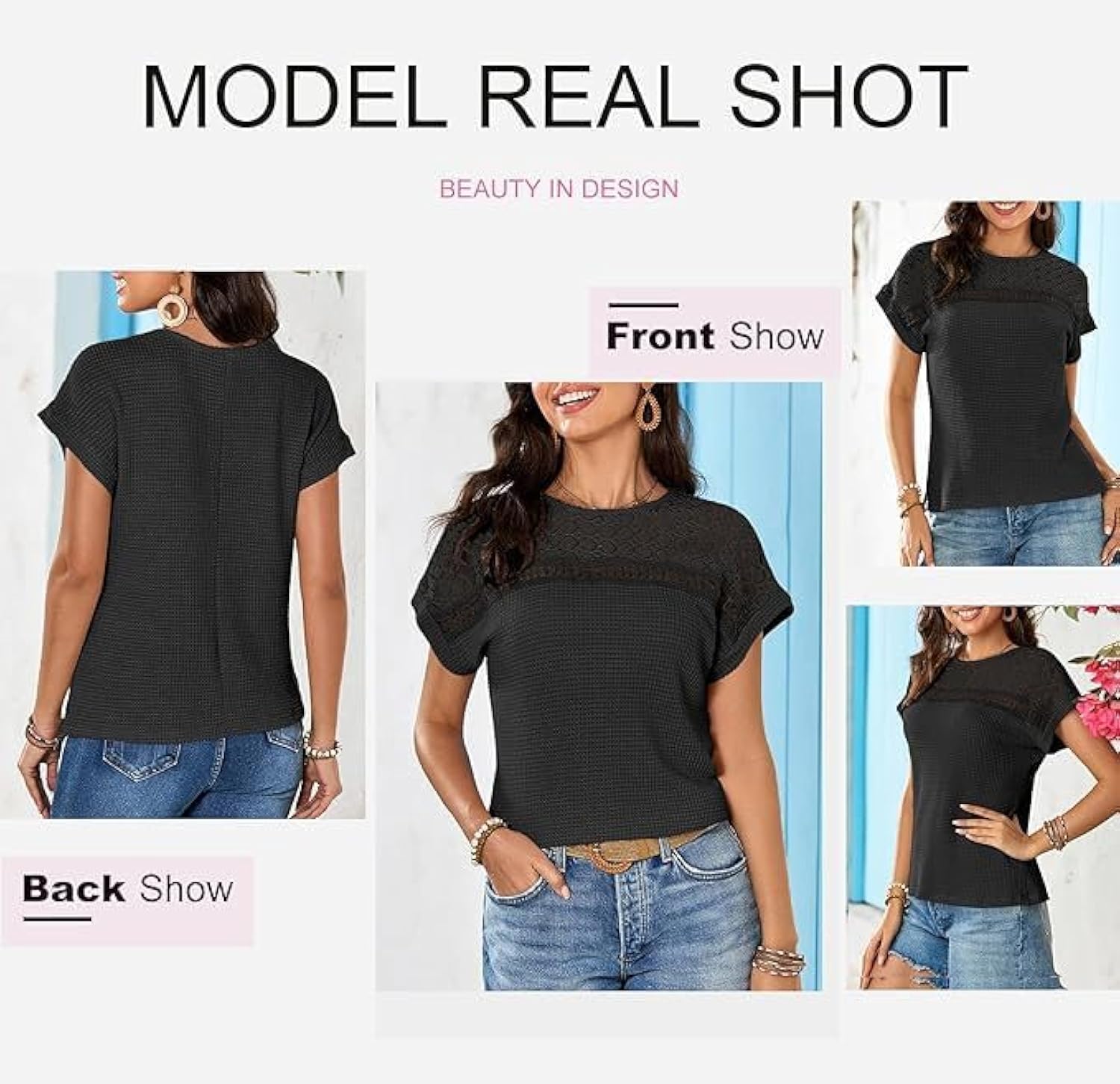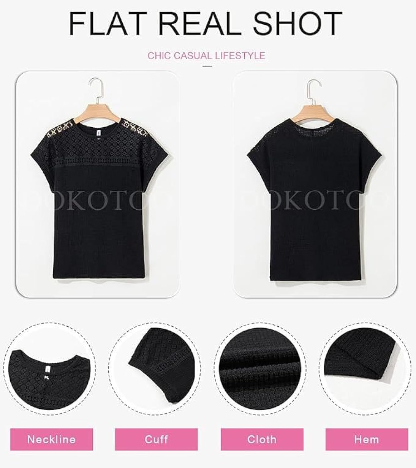 Feature: Short Sleeve Tops for Women, Solid Color, Crochet T-Shirts, Women Waffle Knit T Shirts, Crew Neck, Crochet Top, Lightweight Knit Shirts for Women, Unique Knitting Pattern, Loose Fit Pullover Top, Relaxed Fit.