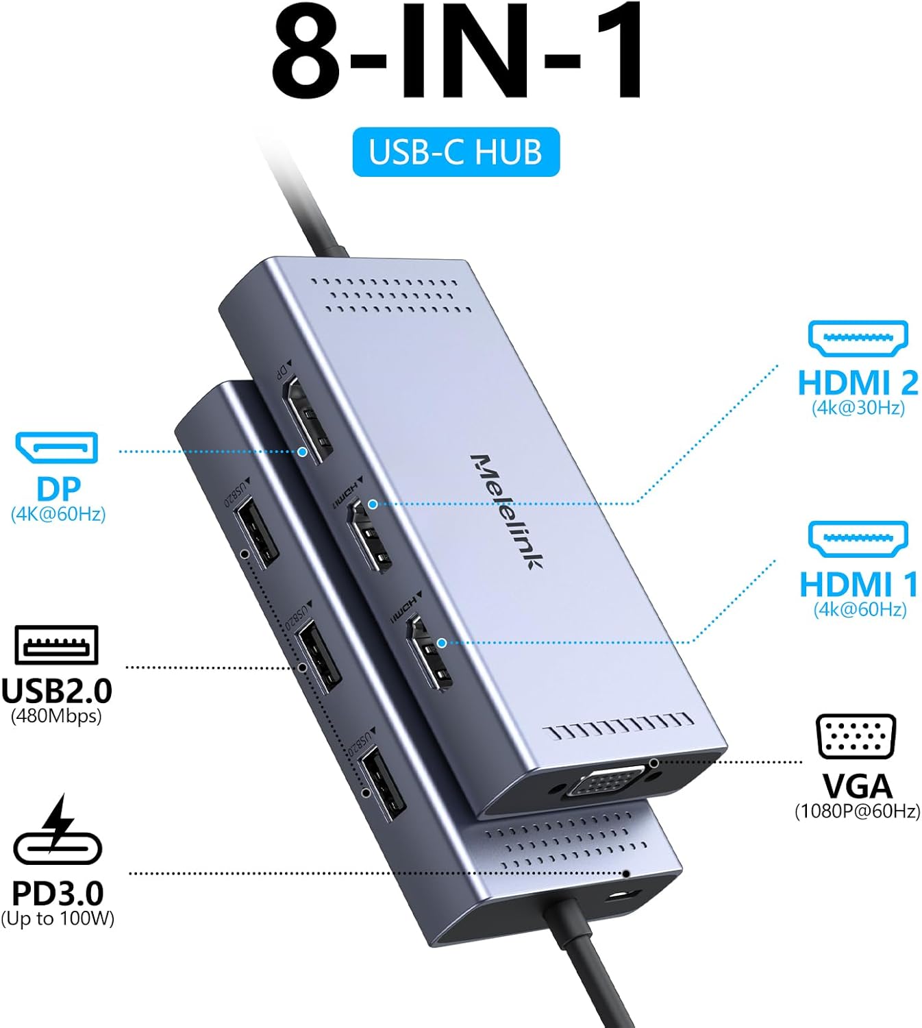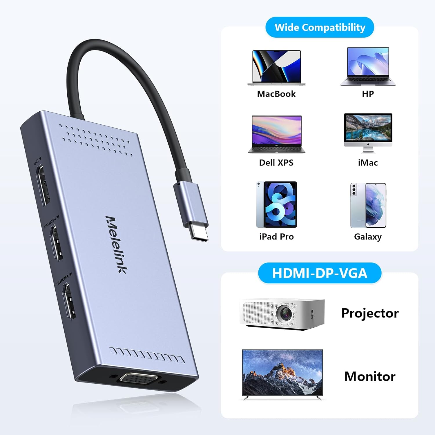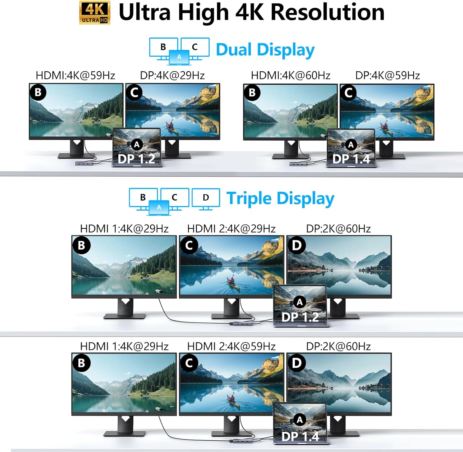 【Docking Station 4K Display Adapter】This laptop docking station features four video output ports: 2 HDMI, 1 DisplayPort (DP), and 1 VGA. It supports up to 4K resolution for dual or triple displays. For quadruple display configurations, all outputs (Dual HDMI, DP, and VGA) will operate at 1080p@60Hz. Please ensure your laptop supports DP1.4 signal output. Note that if the VGA port is in use, the resolution for all displays will be limited to 1080p.