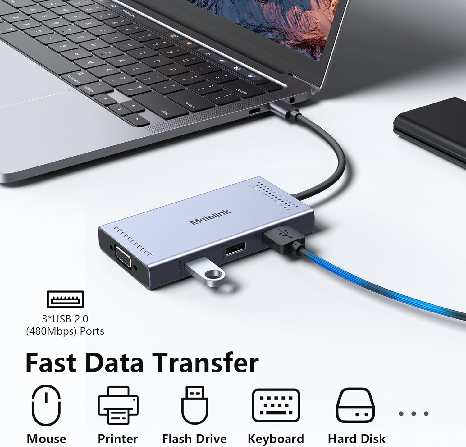 【Stable USB Port】 This USB-C Hub Multiport Adapter features three USB 2.0 ports, allowing you to conveniently connect a keyboard, mouse, USB flash drive, or USB-C hard disks. With transfer speeds of up to 480Mbps, USB 2.0 ensures smooth connections for your keyboard and mouse without any lag.