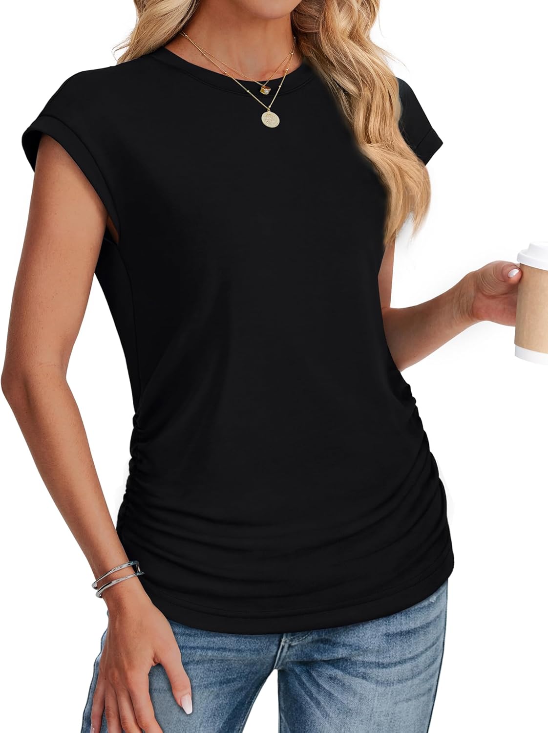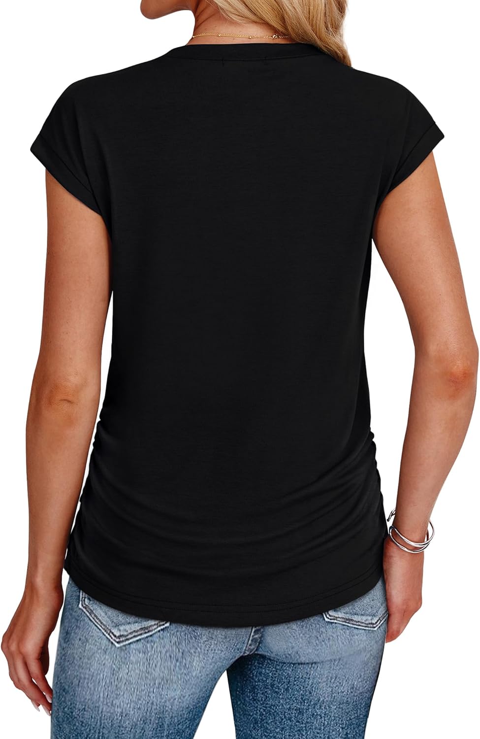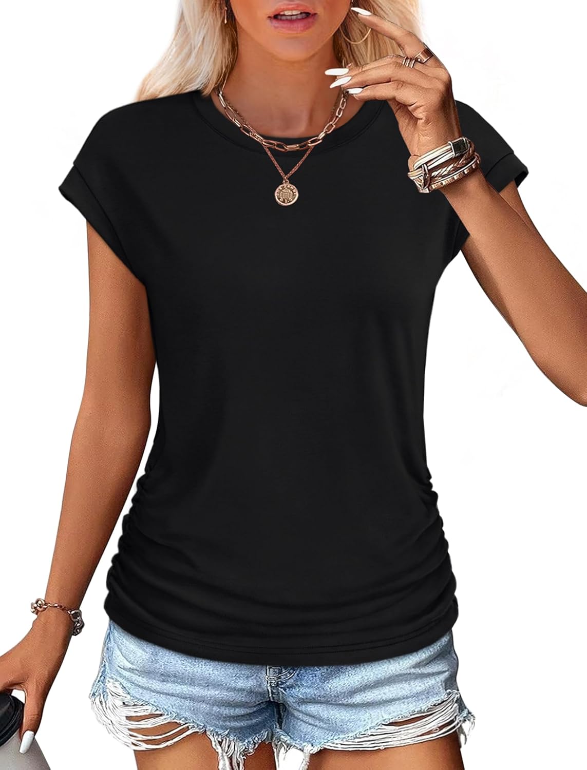 ✦Ruched Design: T shirts for women with feminine side shirring that hides the belly and flatters the figure. The crew neck allows you to bend over freely, while the cap sleeves enhance the silhouette of the shirt, making it look dressier than a plain t-shirt.