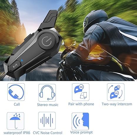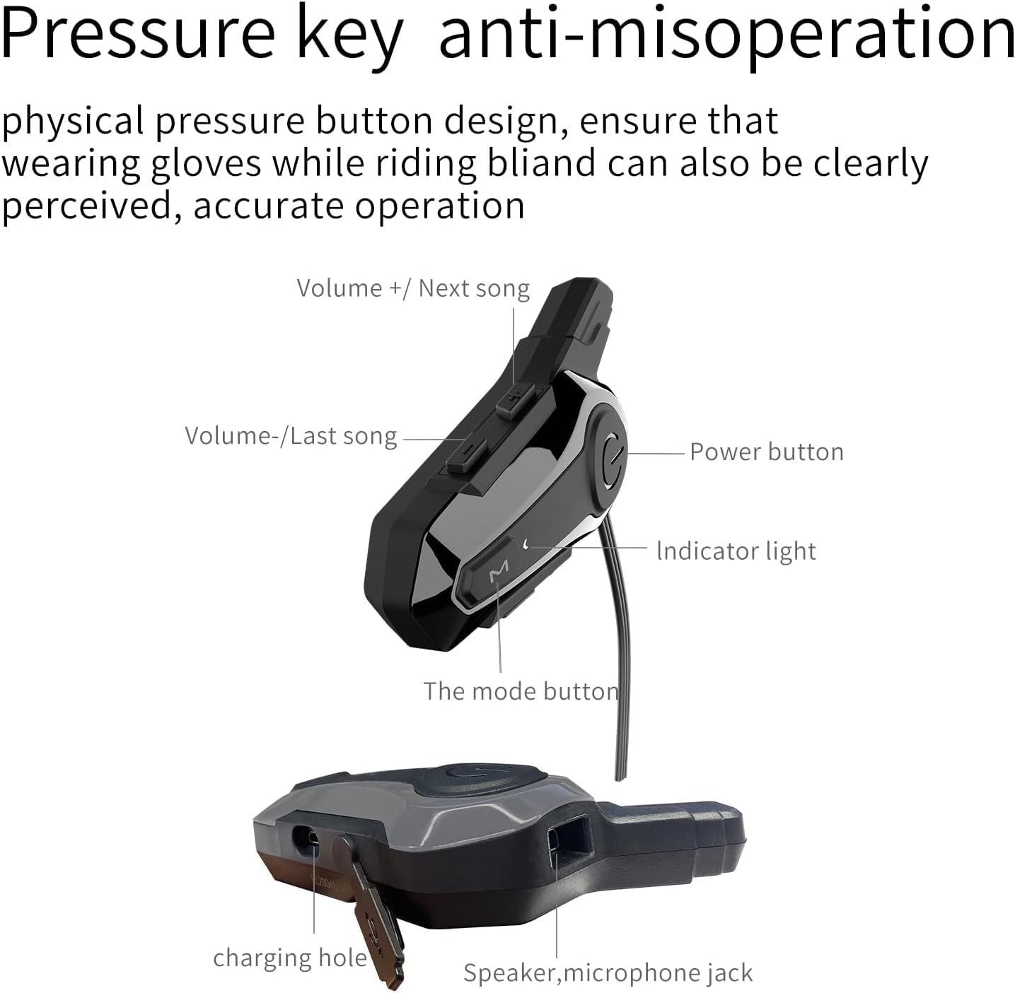 IPX6 WATERPROOF AND PLAYBACK CONTROL: IPX6 waterproof design help you handle all weather conditions, you can use the E1 motorcycle communication systems in rainy day. Easily button control to play/ pause music, previous/next song, switch music to intercom, adjust volume, reject or answer calls.