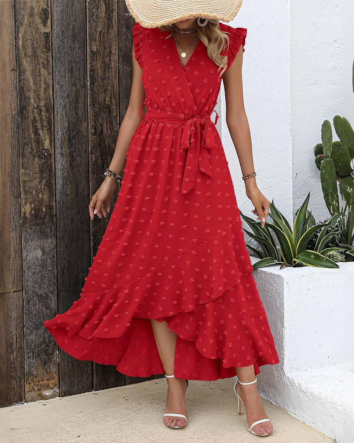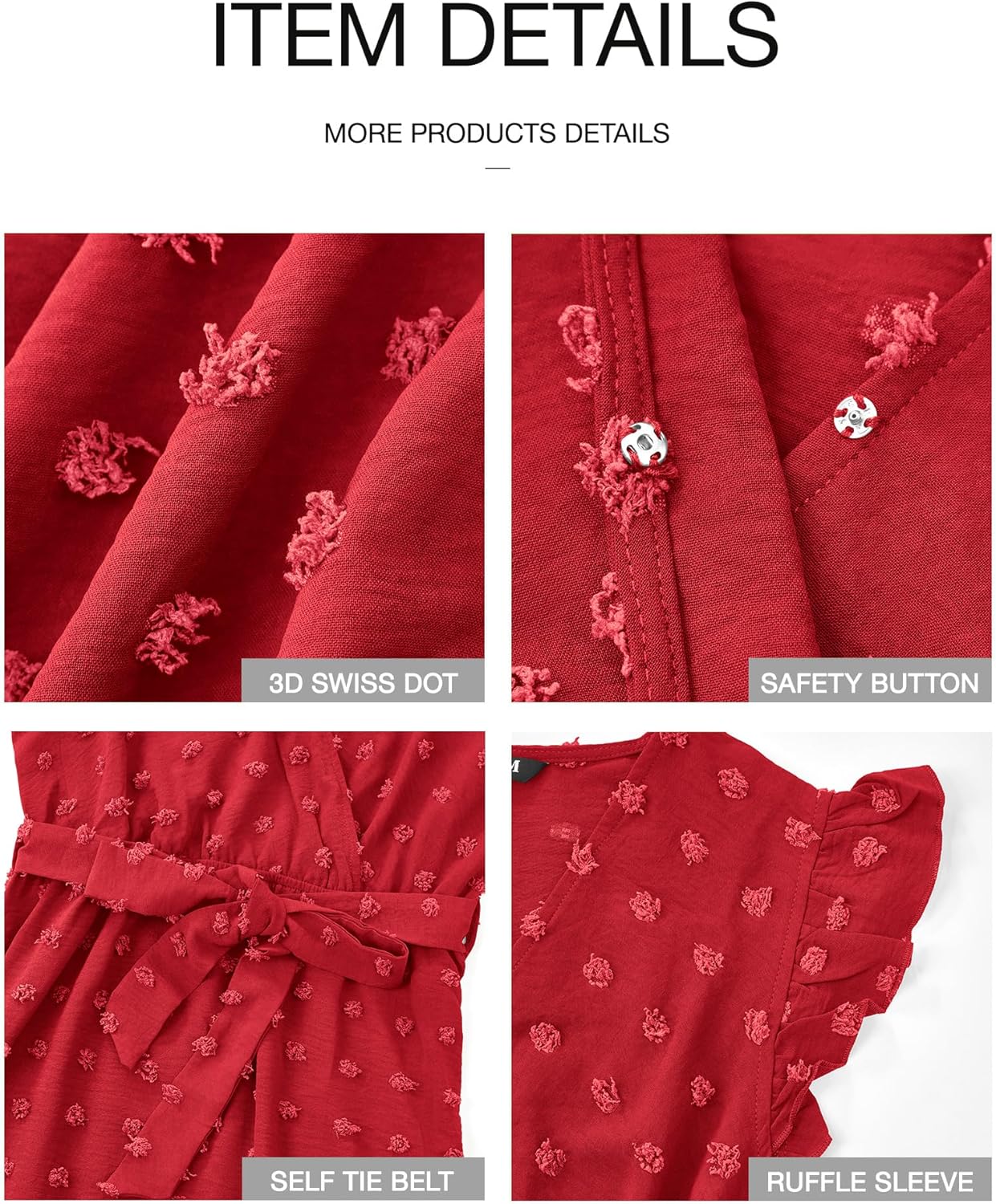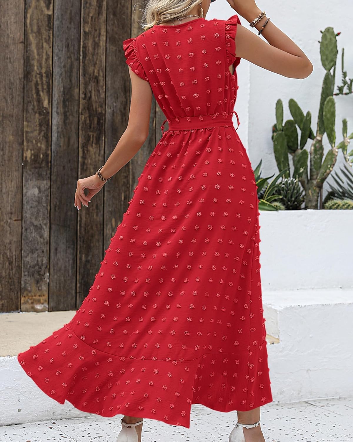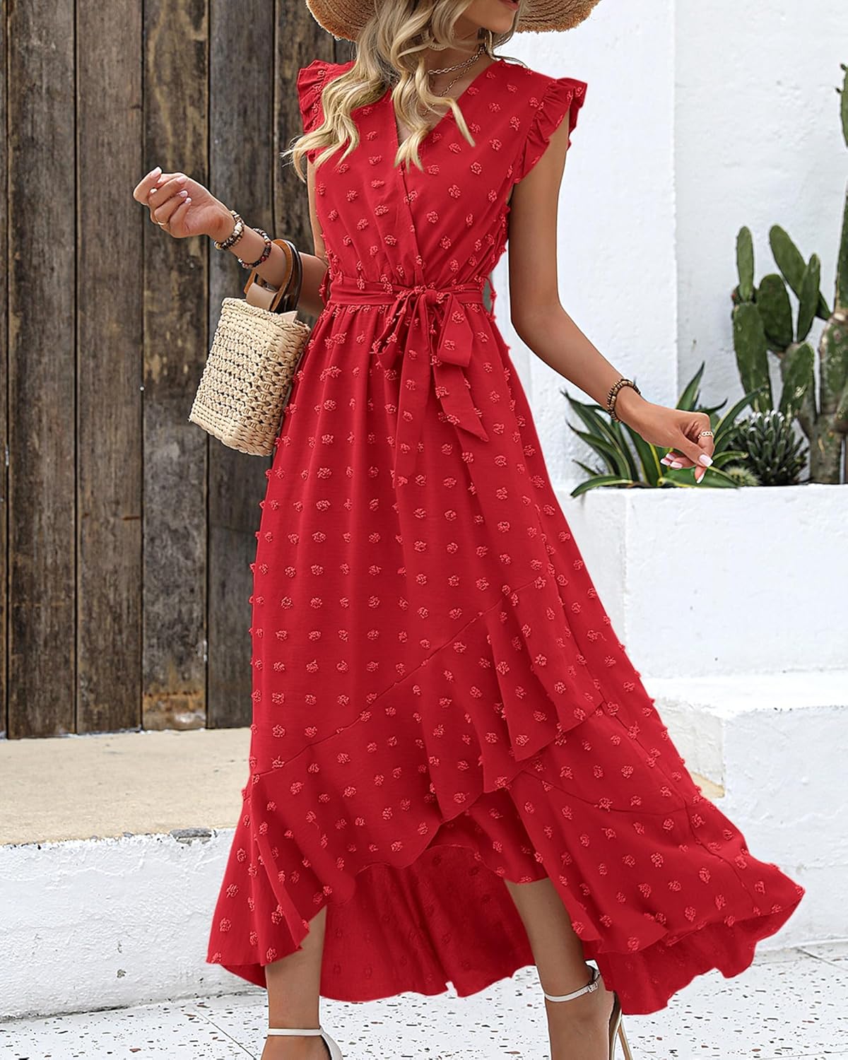 FEATURES: S=US 4-6, M=US 8-10, L=US 12-14, XL=US 16-18, XXL=US 20 / Boho Sundress For Women Summer / All-over Swiss Dot Pattern / Cross V Neck With Safety Button / Ruffle Cap Sleeve / Tie Waist / High Wasit / Wrap Ruffle Split Hem