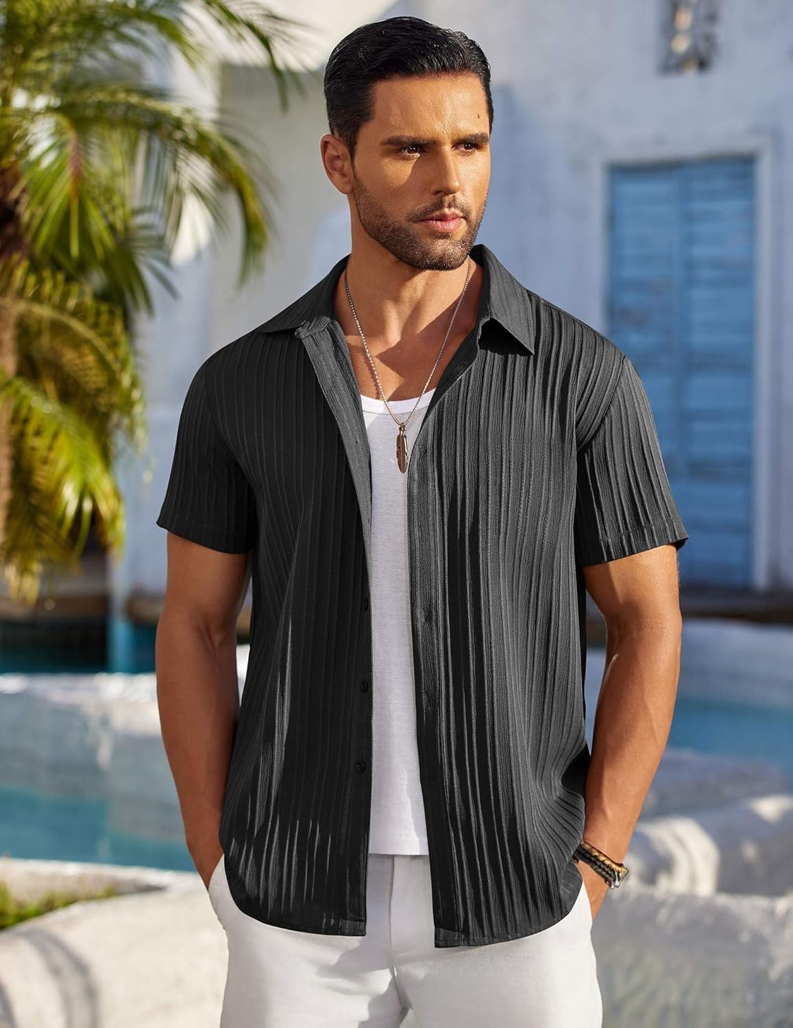 Casual Design--- Men's summer beach shirts features short sleeve, spread collar, button closure, relaxed fit. The vertical texture adds some texture to the shirt, making it more fashionable and simple.