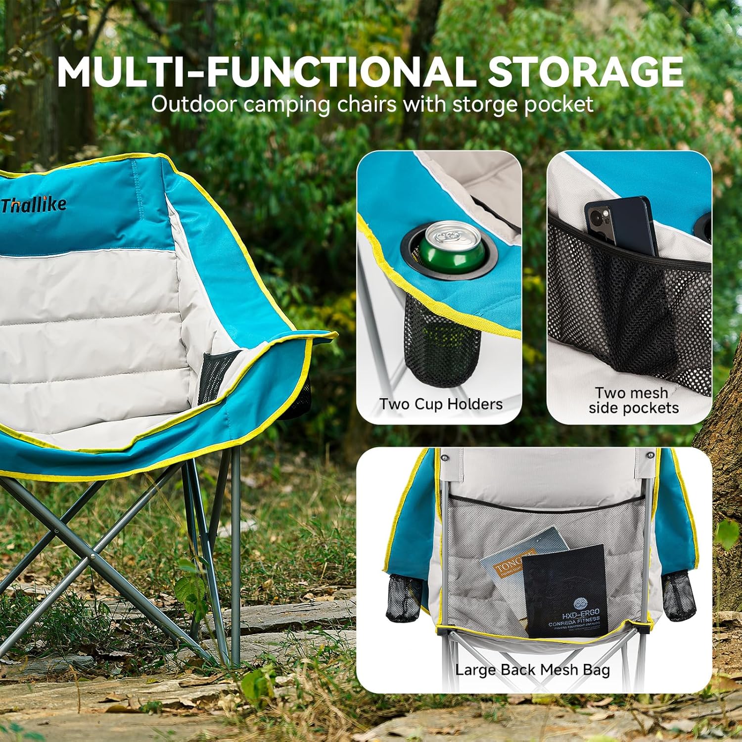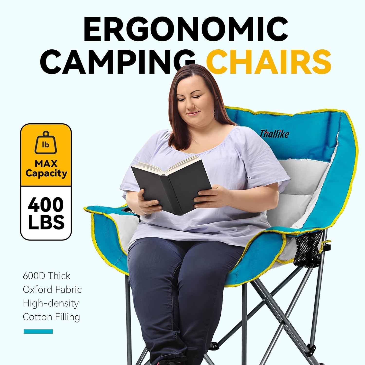 【Oversized Comfort Camping Chair】The THALLIKE Camping Chairs for Adult features a spacious design with high-density padding, offering exceptional support for your back, neck, and hips. Perfect for relaxing at the campsite, backyard, or any outdoor activity.
