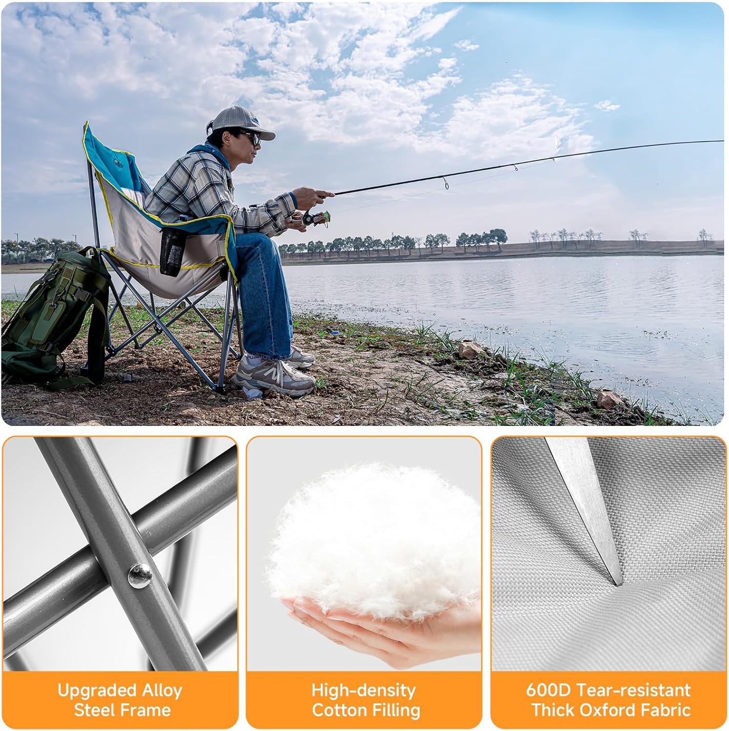 【Heavy Duty & Durable】Built with an upgraded alloy steel frame and 600D Oxford fabric, this outdoor camping lounge chair supports up to 400 lbs. The tear-resistant fabric and reinforced stitching ensure durability, so you can enjoy it season after season.